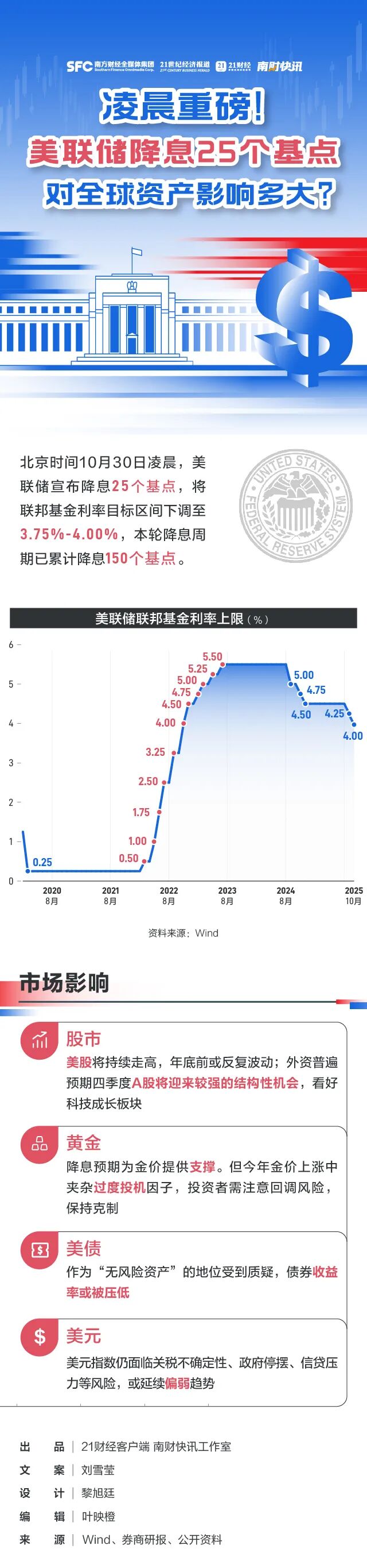 【导读】美联储降息25个基点,公募基金最新解读来了 当地时间10月29日,美联储宣布将联邦基金利率目标区间下调25个基点到3.75%~4.00%之间。这是美 联储继9月17日降息25个基点后再次降息,也是自2024年9月以来第五次降息。 这一决策是否符合预期?美联储未来利率走势如何?是否还有降息可能?降息将对全球各类资产价格产 生哪些影响?对A股和债券市场有何影响?对此,多位业内人士表示,本次降息25个基点符合市场预 期,下阶段仍有望维持降息周期。A股行情有望延续,同时,债券市场整体有望保持强势。 本次降息25个基点在市场预料之内 下阶段仍有望维持降息周期 招商基金研究部首席经济学家李湛表示,本次降息25个基点完全在市场预料之内。尽管本次行动一致, 但美联储内部对未来路径的分歧显著扩大。未来的决策将极度依赖数据,特别是受美国政府"停摆"影响 而延迟发布的一系列关键经济数据(如非农就业报告)。目前,市场对12月降息的概率预期已从会前的 90%以上降至70%左右。 华安基金首席指数投资官、总经理助理许之彦也认为,本次会议降息25个基点符合市场预期。但鲍威尔 在记者会上表态,12月降息节奏并不确定,成为市场的关注焦 ...