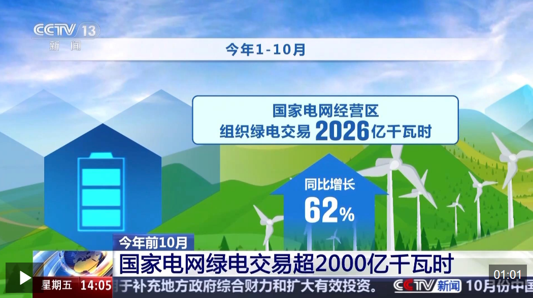最新数据显示,今年1—10月,国家电网经营区组织绿电交易2026亿千瓦时,同比增长62%。 记者今天从国家电网了解到,今年前10个月,国家电网经营区内绿电交易规模超2000亿千瓦时,创历史新高。 北京电力交易中心新能源交易部主任 刘硕:在完善市场机制方面,我们创新推出了多年期的绿电协议,目前已经达成规模超过300亿千瓦时,为新能源企业提供了 长期稳定的收益,也为用户提供了可靠的绿色电力来源。 当前我国的绿电交易正通过这些市场体系,实现绿色电力在更大范围内的优化配置,保障新能源大规模并网和高比例消纳。 交易规模跃升的背后,是新能源装机的持续扩容和市场机制的不断完善。目前,国家电网经营区内,风电光伏新能源装机13.64亿千瓦,同比增长33%。与此同时, 经营区域内,省内中长期市场已全部实现按日连续运行,建立省间电力互济交易模式,促进电力资源在省间优化配置。 ...