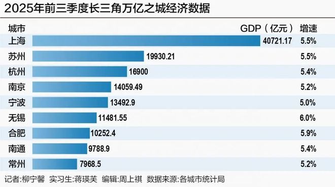 长三角总体经济表现 - 前三季度长三角地区(江苏、浙江、上海、安徽)GDP总量达251,797.17亿元,约占全国GDP总量的25% [1] - 区域内41座城市中,31座城市经济增速跑赢全国平均水平(5.2%),14座城市增速突破6% [1] - 区域内拥有7座GDP规模超1万亿元的城市,按规模排序为上海、苏州、杭州、南京、宁波、无锡、合肥 [1] 各省市经济规模与增速 - 江苏省前三季度GDP总量为102,811亿元,在长三角三省一市中排名第一,增速为5.4% [5] - 浙江省前三季度GDP总量为68,495亿元,增速为5.7%,领跑长三角 [5] - 上海市前三季度GDP总量为40,721.17亿元,增速为5.5% [5] - 安徽省前三季度GDP总量为39,770亿元,增速为5.4% [5] 先进制造业发展 - 上海市人工智能制造业产值增长12.8%,集成电路制造业产值增长11.3%,工业战略性新兴产业产值占全市工业总产值比重达44.1% [1][12] - 江苏省规模以上高技术制造业和数字核心产品制造业均保持两位数增长,高新技术产业产值占规上工业比重达51.8% [1][12] - 浙江省规上工业增速达7.1%,其中高技术制造业增长12.4%,数字经济核心产业增长11.6%,装备制造业增长10.6% [12] - 安徽省高技术制造业增加值大幅增长27.8% [1][12] - 苏州市规上高新技术产业产值达20,096.5亿元,同比增长6.3%,光电子器件、工业机器人和锂电池产量分别增长10.0%、20.6%和55.9% [9] 消费市场表现 - 长三角社零增速排名为浙江(5.2%)、安徽(4.4%)、上海(4.3%)、江苏(4.2%) [13] - 江苏省社零规模以34,788.3亿元排名全国第一 [13] - 以旧换新政策有效拉动家电、汽车、3C等产品销售 [13] - “苏超”、“浙BA”等体育赛事以及展会经济成为消费结构性亮点,前8个月江苏省体育服务业营业收入同比增长13.0%,其中体育组织业务增速高达27.9% [13][14] 城市经济亮点 - 上海市第三产业占GDP比重达79.1%,信息传输、软件和信息技术服务业增加值同比增长15.5% [9] - 在14座GDP增速超6%的城市中,前5名均为浙江城市,浙江共7座城市入榜,安徽4座,江苏3座(徐州、无锡、淮安) [5][6] - 浙江城市的经济快速增长得益于坚实的传统制造业基础、块状经济和充满活力的民营经济主体 [6] 产业发展模式与方向 - 浙江正借助创新推动传统产业进行“内生裂变”,探索链式裂变、创新裂变、转型裂变(数智赋能)和增值裂变等方向 [8] - 江苏省扩内需呈现“制造+服务”双向赋能特色,制造业提供绿色智能产品,服务业依托“苏超”等IP创新消费场景 [13] - 浙江在服务业内需方面表现突出,得益于数字经济与消费场景深度融合、民营经济创新活力及展会经济平台效应 [14]