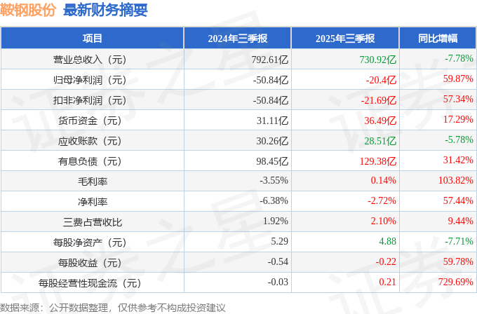 据证券之星公开数据整理,近期鞍钢股份(000898)发布2025年三季报。截至本报告期末,公司营业总 收入730.92亿元,同比下降7.78%,归母净利润-20.4亿元,同比上升59.87%。按单季度数据看,第三季 度营业总收入244.93亿元,同比上升2.86%,第三季度归母净利润-8.96亿元,同比上升62.59%。本报告 期鞍钢股份盈利能力上升,毛利率同比增幅103.82%,净利率同比增幅57.44%。 本次财报公布的各项数据指标表现一般。其中,毛利率0.14%,同比增103.82%,净利率-2.72%,同比 增57.44%,销售费用、管理费用、财务费用总计15.32亿元,三费占营收比2.1%,同比增9.44%,每股净 资产4.88元,同比减7.71%,每股经营性现金流0.21元,同比增729.69%,每股收益-0.22元,同比增 59.78% 问:公司下一步发展规划 答:公司未来会坚持高端化、智能化、绿色化的发函方向,聚焦国家发展战略,紧跟市场实际需求,大 力打造高科技含量、高附加值、高性能指标的高端产品。将新一代信息技术与生产经营深度融合,加快 形成面向生产全流程、管理全方位、产品全生命周期的智能制 ...