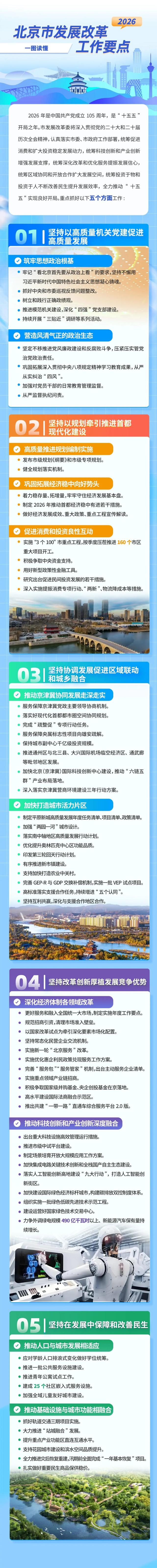 核心观点 - 北京市2026年发展蓝图聚焦于通过高质量党建、规划引领、经济巩固、区域协同、改革创新及民生保障等多维度举措,全面推进首都现代化建设,巩固经济稳中向好势头,并厚植发展竞争优势 [1] 坚持以规划牵引推进首都现代化建设 - 发布市级规划《纲要》和市级专项规划 [7] - 健全规划落实机制 [7] 巩固拓展经济稳中向好势头 - 制定2026年推动首都经济稳中有进若干措施,着力稳存量、拓增量,牢牢守住经济发展基本盘 [12] - 实施"3个100"市重点工程,按季度压茬推进160个市区重大项目开工 [12] - 深入实施提振消费专项行动、"两新"、物流降成本等措施,促进消费和投资良性互动 [12] - 研究出台促进民间投资发展的若干措施 [12] - 积极争取中央资金支持,用好新型政策性金融工具 [12] 坚持协调发展促进区域联动和城乡融合 - 服务保障京津冀党政主要领导协商机制,推动京津冀协同发展走深走实 [13] - 落实好现代化首都都市圈空间协同规划,完成"疏整促"专项行动任务 [13] - 服务保障央属标志性项目向雄安疏解 [13] - 保持城市副中心千亿级投资规模 [17] - 推进通州区与北三县、大兴国际机场临空经济区、通武廊等毗邻地区发展 [17] - 深入落实京津冀营商环境建设三年行动方案 [17] - 制定平原新城高质量发展年度任务清单、项目清单、政策清单,加快打造城市活力片区 [17] - 落实南中轴地区高质量发展行动计划,优化提升奥林匹克中心区功能品质 [17] - 印发第三轮回天行动计划,有序推进新市镇建设 [17] 坚持改革创新厚植发展竞争优势 - 加快北京(京津冀)国际科技创新中心建设,推动"六链五群"产业布局落地 [17] - 出台重大科技设施高效管理运行措施,推进市级中试平台建设 [20] - 制定场景培育开放大规模应用工作方案,推动科技创新和产业创新深度融合 [20] - 加快集成电路关键技术创新和全栈国产自主生态建设 [20] - 落实人工智能创新高地建设"九大行动",打造人工智能创新街区 [20] - 加快建设国际绿色经济标杆城市,构建碳排放双控制度体系,组织实施一批绿色低碳先进技术示范工程 [20] - 建设运营好国家绿色技术交易中心,力争外调绿电规模490亿千瓦时以上、新能源汽车保有量持续增长 [20] - 更好服务和融入全国统一大市场,制定实施年度工作要点,规范招商引资,清理市场准入壁垒 [20] - 以国家改革试点为牵引深化要素市场化配置,坚持常态化民营企业交流机制,深化经济体制各领域改革 [20] - 实施新一轮"北京服务"改革,实施优化惠企利民政策兑现服务工作方案,完善"服务包""服务管家"机制,出台主动服务企业清单 [20] - 实施重点领域产业链招商,积极争取国家级并购基金、央企创投基金在京落地 [20] - 高水平建设国际法商融合示范区,推出共建"一带一路"直通车综合服务平台2.0版 [20] - 支持加快打造农业中关村 [17] - 完善GEP-R与GDP交换补偿机制,实施一批VEP试点项目 [17] - 高标准落实支援合作任务,坚持互利共赢,深化与支援合作地区合作 [17] 坚持在发展中保障和改善民生 - 应对学龄人口排浪式变化做好学位统筹,推进一批公共服务设施建设 [25] - 推进青年公寓试点工作,建成25个社区嵌入式服务设施,加强全域儿童友好城市建设 [25] - 抓好轨道交通三期项目实施,大力推进"站城融合"发展,提升重点产业功能区直连互通水平,推动基础设施与城市功能相融合 [25] - 支持花园城市建设和滨水空间品质提升 [25] - 全力推进灾后恢复重建,汛期前全面完成"一年基本恢复"项目 [25] - 扎实做好重要民生商品保供稳价 [25]