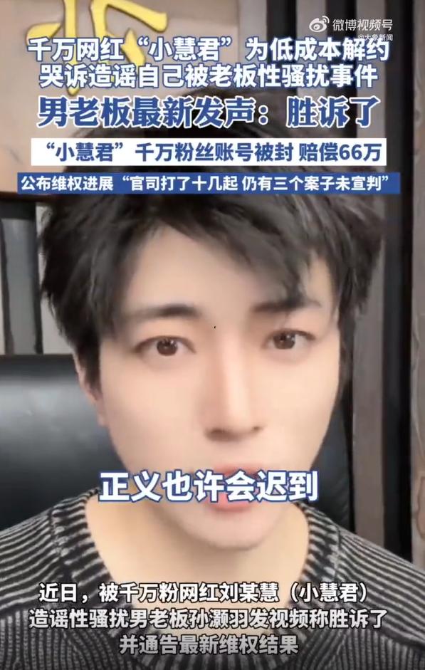 自导自演"职场性骚扰",网红小慧君被全网封禁 对于网红圈的新闻来说,反转或许会迟到,但绝对不会缺席。 从自导自演、造谣老板"职场性骚扰"大肆捞金,到败诉法庭、多平台封禁,曾经火爆全网的千万粉变装网红"小慧君",终于迎来了属于自己的审判。 就在近日,被千万粉网红小慧君造谣性骚扰的男老板孙灏羽发布了一则新视频,为那场持续五年的闹剧画上了句号。 在视频中,孙灏羽公布了最新的维权结果: 第一,网红小慧君的抖音和快手千万粉账号均被平台封禁; 第二,法院判决其赔偿受害者和损失近60万人民币,赔偿诉讼损失近6万人民币; 第三,在赔偿的基础上,小慧君还需全网公开道歉半年,而若因账号封禁无法履行,则需登报(道歉)。 回顾过往,这场闹剧其实起源于2020年。 彼时的"小慧君"是MCN机构秦皇岛赤度文化传媒旗下的一名动漫博主,凭借发布妆前妆后巨大反差的变装视频而走红,在短视频平台拥有超过1300万粉 丝。 而在一则变装视频中,小慧君突然声泪俱下,曝光了自己的凄惨遭遇。 镜头前,小慧君晒出抑郁症诊断书,指控孙灏羽在微信上暗示她"脱衣服给他看",多次用露骨提问与暗示,对她进行职场性骚扰。 图源:大象新闻 图源:小慧君 而同公司的网红夫 ...