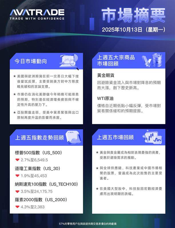 黄金市场表现 - 黄金价格强势突破每盎司4100美元关卡,创下历史新高,现货黄金一度攀升至4116.77美元,收报4106.48美元,上涨2.2% [1] - 12月黄金期货大涨3.3%,报4133.40美元,延续上周冲破4000美元后的涨势 [1] - 黄金的相对强弱指数(RSI)达80,显示市场已进入超买区间 [1] 白银市场表现 - 现货白银刷新纪录,高见52.12美元,收报51.82美元,上涨3.1% [1] - 白银的相对强弱指数(RSI)达83,显示市场已进入超买区间 [1] - 白银2倍杠杆ETF(AGQ)大幅上涨,跟随白银的反弹 [6] 驱动黄金白银上涨的因素 - 美中贸易紧张升温及各国央行持续买盘推动贵金属价格上涨 [1] - 市场对美联储降息的预期升高 [1] - 强劲的避险需求支撑贵金属势头 [6] 美国股市表现 - 美国主要指数在周五抛售后大幅反弹,标准普尔500指数上涨0.34%至6691.25点 [3] - 道琼斯指数上涨0.55%至46311点,纳斯达克100指数上涨0.5%至24910.75点 [3] - 罗素2000指数上涨1.34%至2471.3点,市场反弹得益于特朗普总统在对华贸易方面的语气软化以及关税担忧的缓解 [3] 欧洲股市表现 - 欧洲市场表现出韧性,富时100指数在美国软化对华言论后全球情绪反弹的推动下小幅上涨 [6] - DAX、CAC及EURO STOXX 50指数大幅上涨,随着整个欧洲的风险情绪改善而从早些时候的疲软中恢复 [6] - 金融业受益于信心的恢复和贸易担忧的缓解,尽管法国面临政治不确定性 [4] 其他资产类别表现 - WTI原油价格温和回升,上涨约1.3%,原因是贸易紧张局势缓解带来的乐观情绪 [6] - 以太坊ETF(ETHU)因加密货币市场重新燃起乐观情绪和投机性资金流入增加而飙升 [6] - 科尔士百货(KOHLS)在令人失望的销售指引和零售业持续疲软之后显着下跌 [6] 市场情绪与关键指标 - 波动率指数(VIX)保持高位,显示在持续不确定性下波动性仍然是一个因素 [6] - 美国10年期国债收益率走低,因投资者寻求避险资产并预期美联储可能采取宽松政策 [6] - 风险偏好呈现谨慎/乐观态势,美元指数在避险支持下坚守 [6]