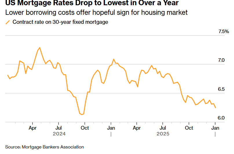 美国抵押贷款利率在上周降至自2024年9月以来的最低水平,为近年来在高利率与高通胀重压之下持续低迷的美国 住房市场于2026年新年伊始带来一复苏丝希望。 根据美国抵押贷款银行家协会(MBA)周三发布的统计数据,在截至1月2日(包含元旦假期)的一周内,美国30年期抵 押贷款的合同利率下降7个基点至6.25%。用于购买更昂贵住房的30年期大额(jumbo)类型房屋抵押贷款利率降至 6.32%,创下2023年4月以来最低点位。 这些数据对近年来一直受可负担性约束所掣肘的美国住房市场而言无疑令人鼓舞。根据全美房地产经纪人协会 (NAR)的数据,合同签约量已连续四个月回升,表明楼市购置者们刚刚进入新年之际,美国房地产销售动能正在持 续增强。 如上图所示,美国抵押贷款利率降至一年多来最低,借贷成本的显著下降有望为美国住房市场带来一丝增长希望信 号。 尽管借贷成本下降,但是MBA的购房指数在上周经季节性调整后仍然下降6.2%。不过,年末假期前后买家兴趣减 少,叠加市场波动性加大是常见现象。与此同时,再融资指标经调整后意外上升7.4%。 MBA的调查自1990年以来每周开展,使用来自抵押贷款机构、大型商业银行与储蓄机构的详细 ...
