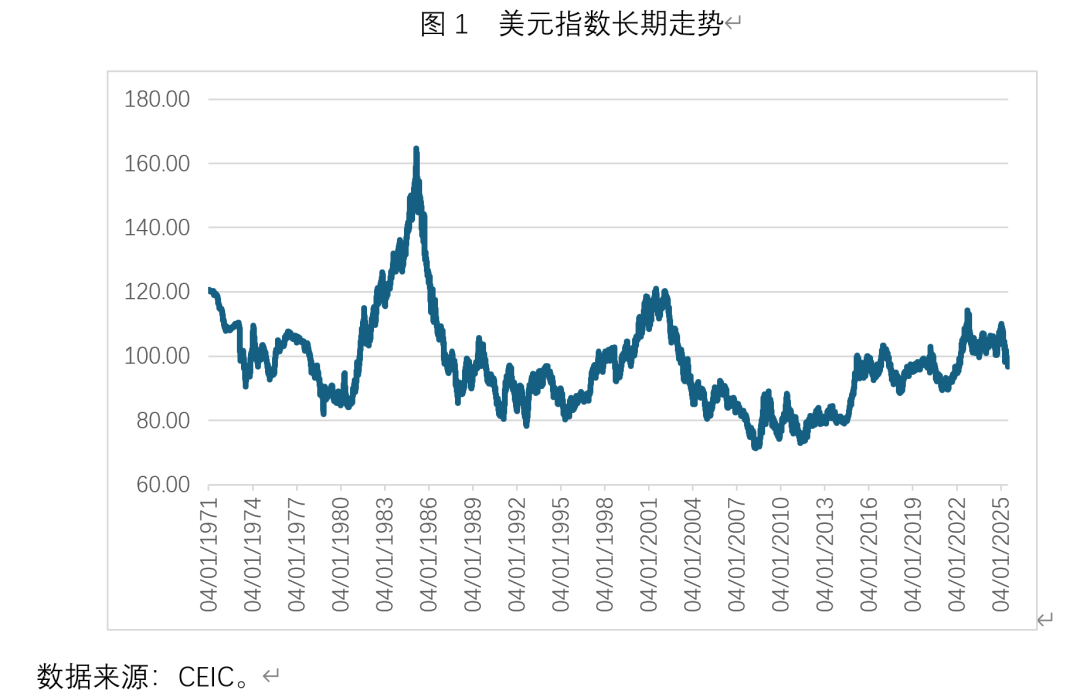 2022年9月底至2025年6月底,美元指数已经由114.1下降至96.9,降幅为15.1%。考虑到上一轮美联储加息周期已经结束,且美联储从2024年9月起已经步 入降息周期,笔者认为,我们基本上可以确定,从2022年9月底起至今,美元指数大概率已经步入新的一轮长周期,且美元指数的下行期可能持续较长时 间,后续跌幅也会相当显著。 注:本文第一部分发表于《财经》杂志,2025年7月8日。第二部分发表于《中国外汇》,2025年第24期。转载请注明出处。 一、美元指数大概率步入较长下行期 1971年至今,美元指数大致走出了三个先下降、后上升的长周期(图1)。 第一个周期的下降期为1971年年初至1978年10月底,美元指数由120.5下降至82.1,降幅为31.9%;上升期为1978年10月底至1985年2月底,美元指数由82.1 上升至164.7,升幅为100.6%。第二个周期的下降期为1985年2月底至1992年9月初,美元指数由164.7下降至78.3,降幅为52.5%;上升期为1992年9月初至 2001年7月初,美元指数由78.3上升至120.9,升幅为54.4%。第三个周期的下降期为2001年7月初至2 ...