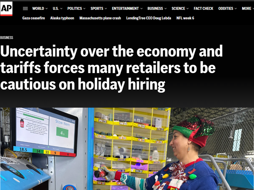 美联社报道,对经济和关税的不确定性促使零售商削减或推迟在分销中心打包订单、在商店为顾客服务以及在年度最 重要销售季搭建节日装饰品的季节性工人的招聘计划。美国圣诞节公司计划招聘220名临时工,比往常提前近两个月 开始招聘,CEO丹·卡斯特雷拉表示。去年,该公司在旺季期间雇用了300人。 【环球网财经综合报道】近日,全美商业经济协会(NABE)调查显示,经济学家上调了今明两年美国经济的增长预 期,但预计就业增长将依旧疲弱。受访经济学家预计,经通胀调整后的美国GDP今年将增长1.8%,高于6月预测的 1.3%。 报道还提出,零售商的招聘计划是美国假日购物季的第一个迹象,而今年美国就业市场失去了动力,部分原因是特朗 普的贸易战产生了不确定性,令管理者在招聘决策上感到瘫痪。分析师也将密切关注消费者在零售商在接下来几个月 因高关税成本而推高价格时的反应。 ...