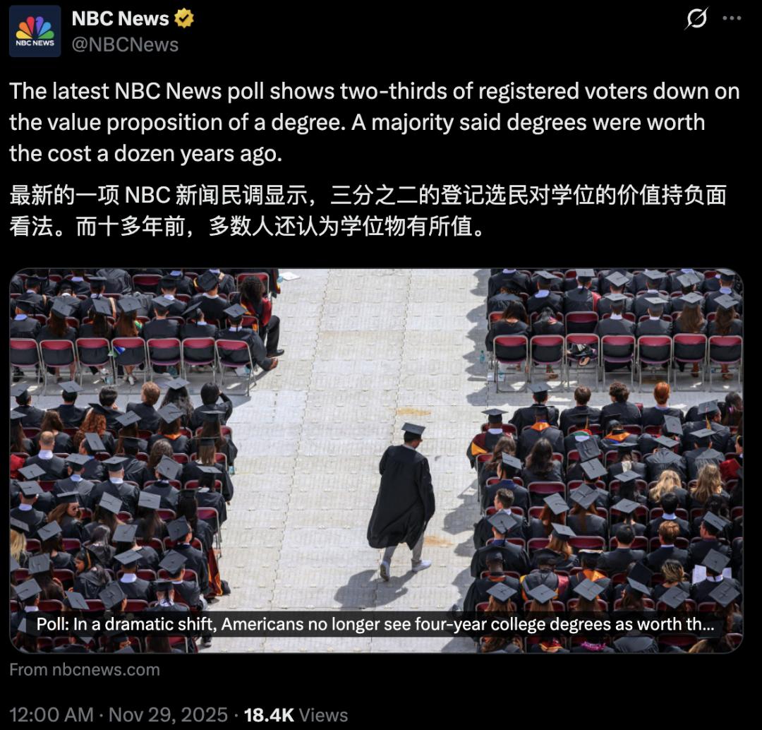 近日,美国一项令人震惊的民调结果显示,63%受访者认为四年制大学学位已经不再「值回票价」。负债上学,毕业即失业,越来越多的美国 人不再相信「大学改变命运」。 四年制大学怎么一下子「不香了」? 曾经的金科玉律,如今被重新审视。 支付高昂学费,毕业却要面临失业和终身负债的时代该结束了! 今年10月,NBC新闻针对1000名美国注册选民的一项民调,揭示出新一代美国人在对待上大学观念上的一场巨变。 在调研中,63%的注册选民对大学学位的价值持悲观态度,他们不再认为四年制大学学位值回高昂的学费,也不再盲从「大学可以改变命运」这样的话。 曾一度被视作「美国梦」核心环节的大学文凭越来越令人失望。 还有网友贴出了2023年《华尔街日报》的民调结果,约56%的被调查者认为四年制大学学位不值其费用。 是什么导致了这十几年间,美国人对大学价值的评价如此急剧下滑? 下面是网友们的一些看法: 不断上涨的学费推高了学生债务,许多岗位本身也不再需要学位,加之AI的冲击…… 越来越多美国人开始重新审视与重估大学学位的价值。 逐渐失效的「万能钥匙」 上大学曾是许多美国人追求更好生活的默认选项。 如今,这个默认选项正变得越来越不可靠。 2013 ...