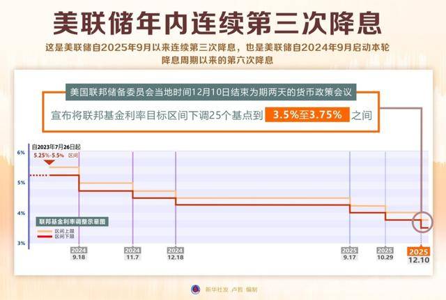 美联储12月货币政策会议决议与市场影响 - 美联储宣布将联邦基金利率目标区间降至3.5%至3.75%,降息25个基点,符合市场预期 [1] - 这是自2024年9月启动本轮降息周期以来的第六次降息,也是自9月以来连续第三次降息 [1] 会议内部决策与核心动因 - 公开市场委员会12名成员中,9人支持降息25个基点,3人投反对票,为2019年9月以来反对票最多的一次 [3] - 反对票中,两人主张维持利率不变,一人主张降息50个基点,显示内部分歧显著 [3] - 本次降息的核心动因是就业市场走弱,美国失业率连续三个季度上行,前三季度分别为4.0%、4.2%、4.4%,显著高于2024年的3.8%-4.0% [4] - 美联储主席鲍威尔在发布会上表示,政策没有预设路径,将“逐次会议决定”,其讲话被解读为“中性偏鸽” [3][4] 对未来降息路径的预测与分歧 - 新的点阵图预期中值显示2026年和2027年各降息一次,但官员预测分布高度离散 [6] - 有8名官员预计2026年有超过一次的降息,同时有11名官员预计降息次数少于一次或加息 [6] - 市场基准情景预期2026年仍有两次降息空间,利率下限有望降至3%左右,上半年可能是降息集中期 [6] - 另一种观点认为,在12月降息后,美联储可能在2026年1-5月进入“政策暂停期”,后续行动取决于经济数据 [6] - 2026年将面临美联储主席换届与美国中期选举两个重要变量 [7] 对人民币汇率及中国资产的影响 - 美联储降息可能导致美元走弱,人民币相对升值,降低留学、海外购物等成本 [10] - 降息将压低美债收益率,可能使美元资产收益率下降,从而增加中国资产的吸引力,引导资金流向新兴市场 [10] - 人民币汇率有望保持韧性,海外资金可能流入人民币资产,对A股估值形成支撑 [11][12] - 美联储降息为中国货币政策提供了外部窗口期,使其能够更加“以我为主” [11] 对黄金价格的影响 - 在降息周期中,黄金通常表现良好 [12] - 但如果2026年美联储降息预期降低,则对金价的支持力度可能会减弱 [12]