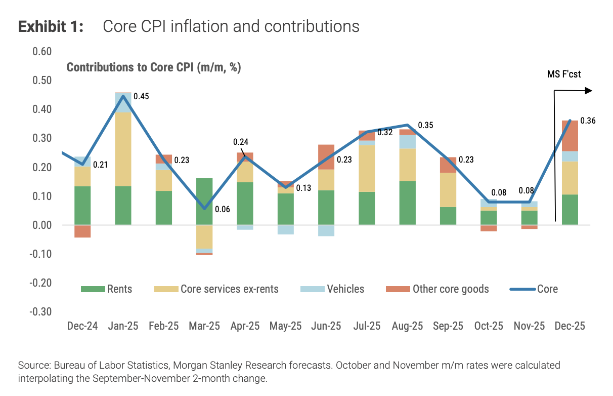 核心观点 - 摩根士丹利预计美国12月核心CPI将因统计技术性因素出现显著反弹,环比增长0.36%,远高于10-11月平均的0.08%,但这主要源于统计扭曲而非真实通胀压力上升 [1] - 投资者需透过12月数据的“噪音”看清真实通胀趋势,并重点关注关税传导效应和住房通胀减速的持续性这两条实质线索 [14] 通胀数据预测与特征 - **整体预测**:预计12月核心CPI环比增长0.36%,整体CPI环比增长0.37%,同比达2.7% [1][5] - **数据性质**:此次数据反弹主要由政府停摆期间的统计扭曲导致,属于“报复性”反弹,而非真实通胀压力上升 [1][4] - **市场解读的不对称性**:强劲数据可能被市场视为技术性噪音而打折扣,但疲软数据则可能成为通胀降温的强烈信号 [3][11] 导致数据扭曲的统计因素 - **双月抽样偏差**:由于10月数据缺失,部分城市价格被结转,导致12月对比基数偏低,预计此偏差将为12月核心CPI贡献约8个基点的上行偏差 [4] - **假日折扣偏差**:11月价格采集延迟过度加权了假日促销折扣,人为压低了核心商品价格,摩根士丹利为此在预测中额外增加3个基点 [4] 各分项通胀表现预测 - **核心商品领涨**:预计12月核心商品环比增长0.59%,创年内新高,其中新车价格环比涨0.21%,二手车涨0.80%,服装大涨1.00%,其他核心商品涨0.70% [5] - **租金通胀正常化**:预计12月业主等价租金(OER)环比增长0.27%,住房租金增长0.18%,未来几个月OER和住房租金预计平均环比增长约0.26% [5] - **核心服务除住房类别回升**:预计该分项环比增长0.34%,远高于10-11月平均的0.08%,其中机票价格环比降0.50%,酒店价格转正增长0.30%,医疗服务增长0.25% [5] - **整体CPI构成**:能源通胀环比放缓至0.43%,食品通胀加速至0.37% [5] 需要关注的焦点问题 - **反弹幅度不确定性**:实际数据出现0.5%环比增长的概率高于0.2%,精确区分“信号”与“噪音”极为困难 [3][8] - **住房通胀减速的持续性**:12月数据将是判断住房通胀是否真正进入更低运行轨道的关键观测值 [9] - **关税传导效应的验证**:10-11月数据未明显体现关税传导,12月数据是关键验证窗口,预计今年以来关税已累计推高核心通胀35个基点,本次将增至45个基点 [3][10] 对PCE指数的影响与市场含义 - **PCE预测**:基于CPI预测,预计12月核心PCE环比增长0.37%,显著高于10-11月平均的0.13%,因PCE篮子中70%的价格来自CPI [11] - **市场影响**:若12月CPI低于预期,对利率敏感资产可能构成更显著的提振;符合或略高于预期的数据可能不会引发市场剧烈反应 [11]