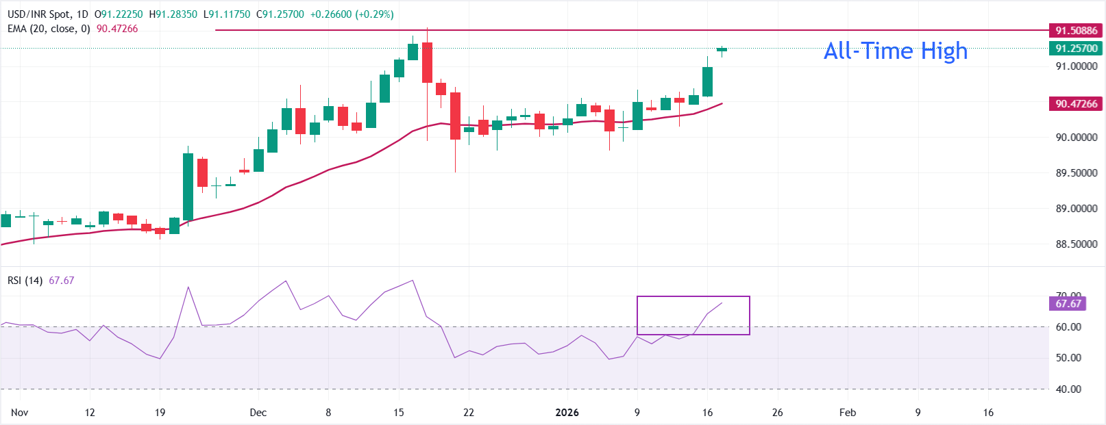 美元兑印度卢比汇率走势 - 美元兑印度卢比汇率连续第四个交易日上涨,并靠近91.55的高点[1] - 汇率上涨的主要驱动因素是印度进口商对美元的强劲需求[1] - 尽管美元本身不算特别强势,但该货币对仍录得上涨[1] 汇率走强的背后动因 - 美国和印度贸易谈判悬而未决,协议尚未签署,导致由实际贸易需求带来的美元买盘持续[1] - 过去半年,外国机构投资者整体在印度股市呈现净卖出状态[1] - 仅一月份,外资净卖出规模就不小,表明部分外部资金采取观望姿态[1] 全球美元与货币政策环境 - 美元指数在98.90附近徘徊,在美国对欧洲加征关税的消息下仍稳住阵脚[2] - 市场关注点转向月底的美联储会议[2] - 美联储一位负责监管的副主席发表偏“鹰派”表态,称利率可能需要更早调整到中性水平以应对就业市场潜在风险[2] 技术分析视角 - 美元兑卢比汇率稳稳站在向上走的20日均线上方,该均线构成支撑[4] - RSI指标在67附近,显示市场动能偏强,但未达极度超买程度[4] - 从技术角度看,只要汇率守住当前支撑区域之上,上涨势头就还有延续空间[4]