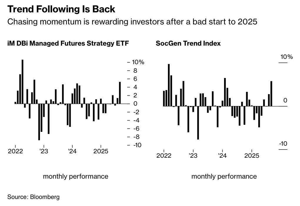 许多事情在九月都出现恶化——美国联邦政府关门、就业前景黯淡,关于美联储独立性的辩论愈演愈烈、甚嚣尘上。然而,在大宗商品、股票和外 汇市场,这个月将被载入史册,因为一种简单的押注——即押注上涨将继续——迎来了三年来最强劲的持续期。 黄金飙升12%,延续了九个月内第八次上涨的势头,而日元对美元汇率进一步下跌。全球股市延续了长达数月的涨势,市值增加了约35万亿美元。 跨资产、跨时区,投资者几乎在所有地方追逐动量,而这距离许多此类交易在美国总统特朗普关税战初期首次受挫仅过去数月。这股趋势在股市中 如此强劲,以至于开始让基金经理们难以跟上。杰富瑞金融集团的数据显示,2025年跑赢基准的纯多头主动管理基金比例已降至22%,有望创下有 记录以来的最差表现。 尽管"害怕错过"是一种始终存在的焦虑,常常刺激此类行为并可能推动进一步上涨,但风险偏好的其他支柱也发挥了作用,以抵消政治和经济压 力。摩根大通公司的策略师在一份报告中表示,经济中的流动性——充斥在银行账户和货币市场基金等处的货币供应——已稳步扩张了两年,并成 为资产价格的主要顺风,再加上美联储的鸽派立场,这为各类资产的上涨提供了背景。 Northern Trust As ...