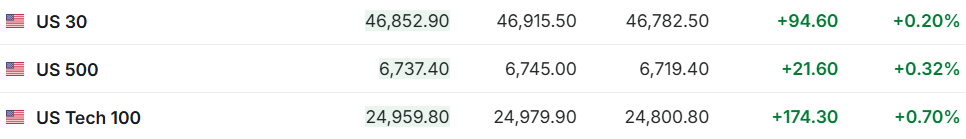 1. 10月6日(周一)美股盘前,美股三大股指期货齐涨。截至发稿,道指期货涨0.20%,标普500指数期货涨0.32%,纳指期货涨0.70%。 | = US 30 | 46,852.90 | 46,915.50 | 46,782.50 | +94.60 | +0.20% | | --- | --- | --- | --- | --- | --- | | = US 500 | 6,737.40 | 6,745.00 | 6,719.40 | +21.60 | +0.32% | | 틀 US Tech 100 | 24,959.80 | 24,979.90 | 24,800.80 | +174.30 | +0.70% | OPEC+ 11月谨慎增产13.7万桶/日,油价小幅走高。当地时间10月5日,OPEC+同意11月小幅增加原油产量,增产幅度为13.7万桶/日。此 举缓解了交易员对超大规模增产的担忧,油价周一开盘走高。截止发稿,WTI原油涨1.22%,报61.62美元/桶。布伦特原油涨1.24%,报 65.33美元/桶。据悉,OPEC+在10月5日的会议后决定将自11月起把原油日产量提高13.7万桶。由于市场对 ...
