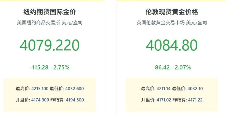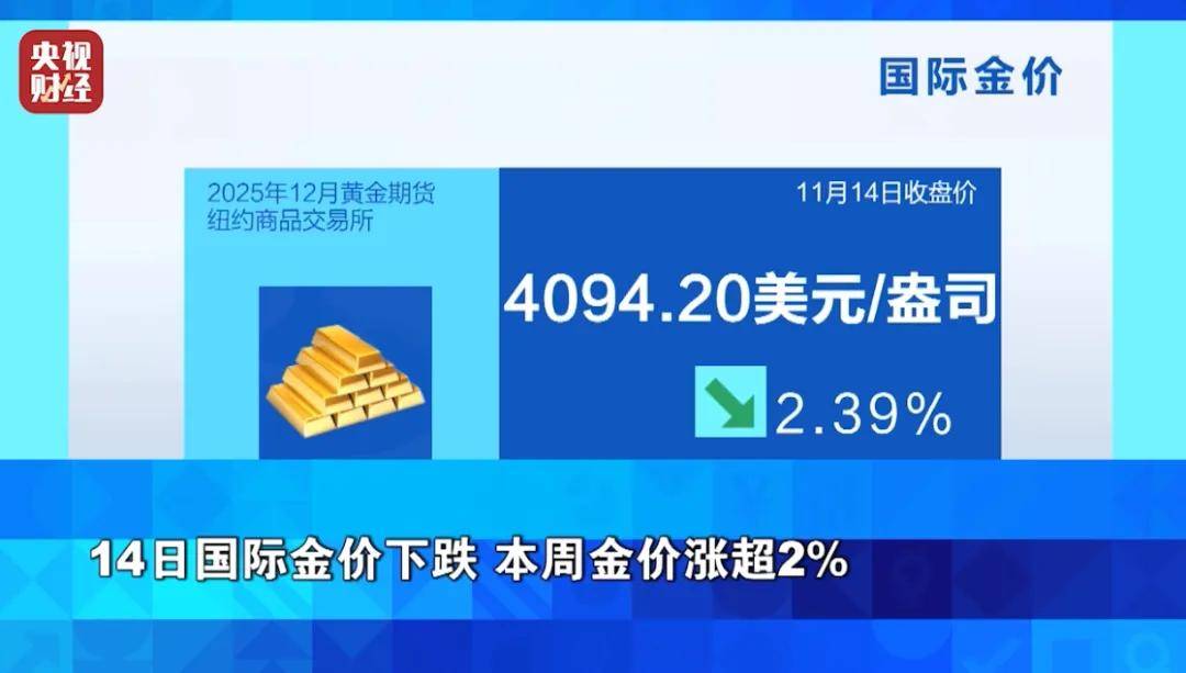 14日国际金价下跌超过2%。近日多位美联储官员陆续公开表态,称应谨慎降息。 校对 | 于泽淼 来源:环球时报 投资者对美联储降息的预期减弱拖累黄金价格下跌,截至收盘,纽约商品交易所12月黄金期价收于每盎司4094.20 美元,跌幅为2.39%。不过,由于前期 涨幅较大,本周国际金价累计上涨2.10%。 审核 | 卢长银 编辑 | 郝珺石 ...