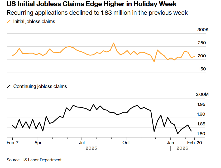 截至上周的当周统计数据显示,美国初次申请失业救济的人数增幅小幅低于经济学家预期,较前值小幅上行,这表明美国企业裁员人数仍然相对较低以及 在"AI颠覆一切"的悲观论调之下美国劳动力市场彰显出强大韧性,并继续远低于过去两年的平均水平。与此同时,作为美国失业人数流动指标的持续申请失 业救济人数较前一周意外下降3.1万人,至183.3万人,创下近10个月以来的最低水平之一。 美国劳工部周四公布的最新数据显示,AI浪潮尚未像"Anthropic风暴"重创软件股那样颠覆就业市场。在截至2月21日当周,首次申领失业救济金人数仅仅增 加约4,000人,至212,000人。机构对经济学家的调查中值显示的普遍预期为216,000人。该统计周期包含总统日假期。 尽管裁员人数较少,招聘速度也显著放缓,但这些数据仍然反映出美国劳动力市场的稳定性以及强化"软着陆"叙事逻辑。正如上图所显示的,美国假日季当 周初请失业金人数小幅上升,前一周持续申领人数则意外降至183万人。 围绕假期期间,申领数据可能会出现波动。不过,目前首次申领救济金人数的水平相对温和,进一步印证了近期其他一些数据所显示的情况,即美国劳动力 市场出现了一定程度的企稳,以及 ...