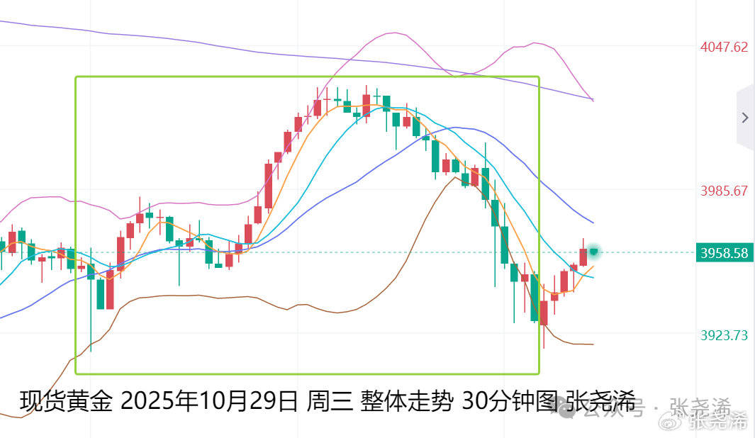 具体走势上,金价自亚市开于3950.69美元/盎司,先行走低录得日内低点3916.97美元,之后回升震荡,午间多头开始发力,一路反弹到18点时段录得日内 高点4030美元,之后遇阻回落,美盘时段持续回撤,至盘尾收于3930.21美元,日振幅113.03美元,收跌20.48美元,跌幅0.52%。 影响上,受到支撑和止跌形态的看涨买盘推动,金价先行走强,而由于阻力压制,以及市场对于美联储降息即将落地和周四中美贸易协议框架敲定和会 晤,而遇阻回撤,并在美联储如期降息25个基点,美联储主席鲍威尔打压了市场对12月份再次降息的预期,美元指数扩大涨幅,打压金价保持回撤最终收 跌。 展望今日周四(10月30日):国际黄金开盘再度先行走强,继续受到止跌形态的看涨买盘,以及受到昨日特朗普:未能协调好与金正恩的会晤时间、美国宣 布新一轮对俄制裁,重点针对两家石油公司等产生的避险情绪,同时,虽然鲍威尔直言12月降息不是板上钉钉,但对市场来说,也是概率很高,要不然怎 么不说12月降息概率很低。并且美联储米兰还支持降息50BP,故此对于后市来说,金价仍处于降息周期中,而当下只需等待短线的利空出尽。 来源:张尧浠 张尧浠:风险预期利空即 ...
