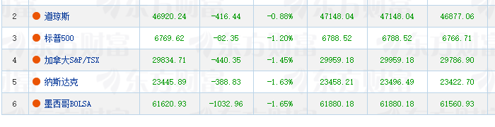 当地时间周二,美股承接亚太跌势,开盘全线大跌。 美股三大指数集体低开,截至发稿,道琼斯指数跌0.88%,标普500指数跌1.2%,纳斯达克综合指数跌1.63%。 | 2 | ● 道琼斯 | 46920. 24 | -416. 44 | -0. 88% | 47148.04 | 47148.04 | 46877.06 | | --- | --- | --- | --- | --- | --- | --- | --- | | 3 | ● 标普500 | 6769.62 | -82.35 | -1.20% | 6788.52 | 6788. 52 | 6766. 71 | | 4 | ● 加皇大S&P/TSX | 29834. 71 | -440. 35 | -1.45% | 29959. 18 | 29959. 18 | 29786.90 | | ഹ | ● 纳斯达克 | 23445.89 | -388.83 | -1.63% | 23458.21 | 23496. 49 | 23422. 70 | | 6 | 墨西哥BOLSA | 61620. 93 | -1032.96 | -1.65% | 61880. 1 ...