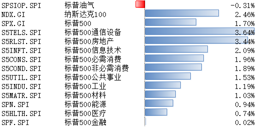 宏观经济方面,美国9月中小企业乐观程度指数不及预期。美国9月NFIB中小企业乐观程度指数录得 98.8%,低于预期值100.6%和前值100.8%。 美国10月房产市场指数超预期回升。美国10月NAHB房产市场指数录得37,高于预期值33和前值32。 主要指数相关情况 1、一周指数表现 上周,标普油气指数整周下跌0.31%,纳斯达克100指数整周上涨2.46%,标普500指数整周上涨1.70%, 其覆盖的11个行业板块全部上涨,其中通信设备领涨3.64%。 | SPSIOP. SPI | 标普油气 | -0. 31% | | --- | --- | --- | | NDX.GI | 纳斯达克100 | 2. 46% | | SPX. GI | 标普500 | 1. 70% | | S5TELS. SPI | 标普500通信设备 | 3.649 | | S5RLST. SPI | 标普500房地产 | 3. 44% | | S5INFT. SPI | 标普500信息技术 | 2. 09% | | S5CONS. SPI | 标普500必需消费 | 1.96% | | S5COND. SPI | 标普500非必需 ...