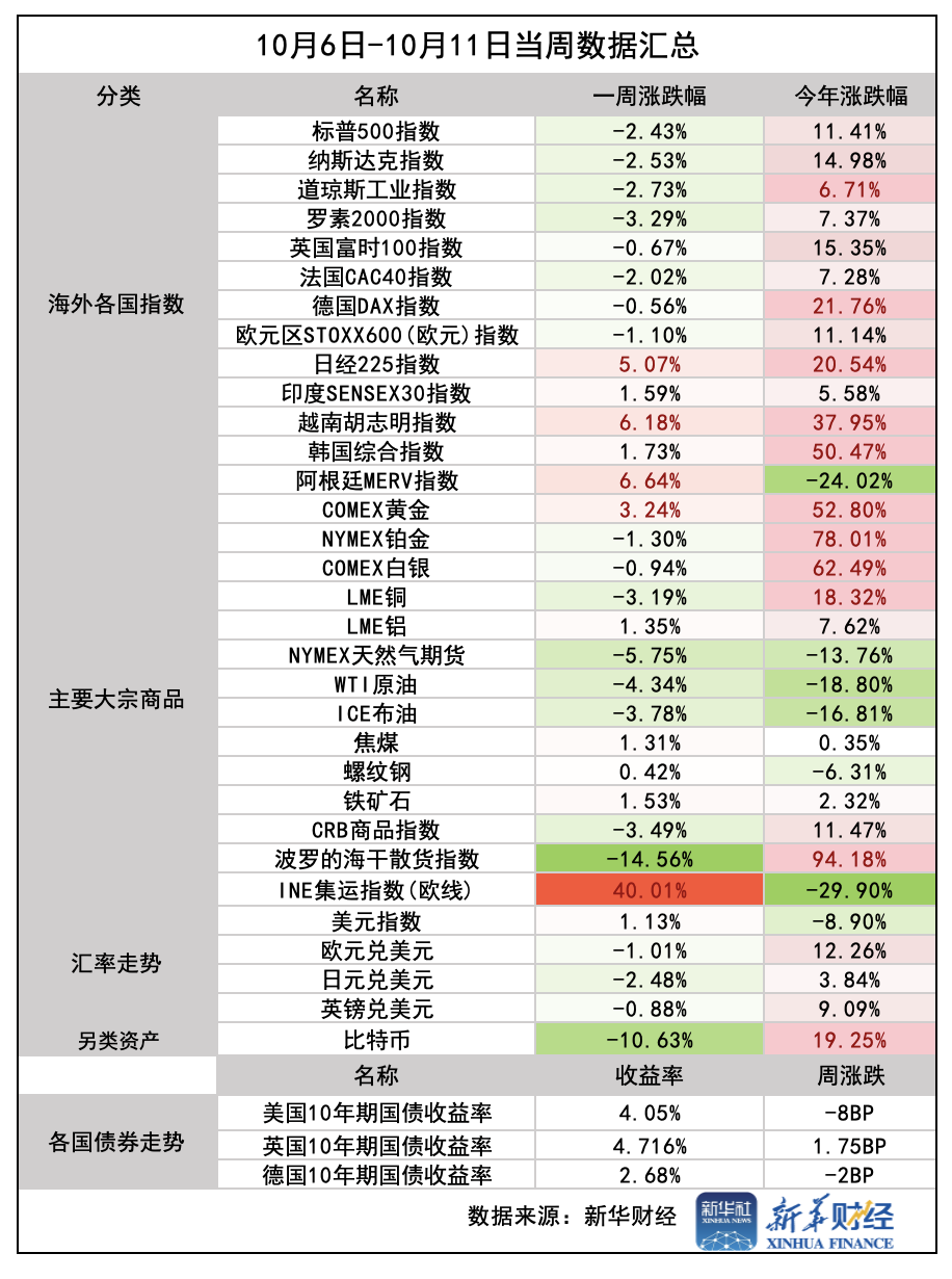 全球主要股指表现 - 美国三大股指集体下挫,标普500指数累计下跌2.43%,道琼斯工业指数累计下跌2.73%,纳斯达克指数累计下跌2.53%,罗素2000指数累计下跌3.29% [1][3] - 美国科技股七巨头指数本周累计下跌2.69%,其中特斯拉下跌3.8%,苹果下跌近5%,Alphabet下跌逾3.6% [1] - 欧洲斯托克600指数下跌1.10%,德国DAX 30指数累计下跌0.56%,法国CAC 40指数下跌2.02%,英国富时100指数累计下跌0.67% [1][3] - 亚太市场表现分化,日本日经225指数累计上涨5.07%并创下历史新高,韩国KOSPI指数全周累计上涨1.73%,印度SENSEX30指数累计上涨1.59% [1][3] 外汇与债券市场动态 - 美元指数整体大幅上涨,一度突破99关口创两个月新高,周五收于98.82,累计上涨1.13% [2][3] - 非美货币普遍走弱,日元兑美元累计跌幅为2.48%,一度突破153关口,欧元兑美元累计下跌1.01%,英镑兑美元累计下跌0.88% [2][3] - 美国10年期国债收益率为4.05%,周下跌8个基点,英国10年期国债收益率为4.716%,周上涨1.75个基点,德国10年期国债收益率为2.68%,周下跌2个基点 [3] 大宗商品市场走势 - 黄金价格大幅飙升,伦敦现货黄金首次站上4000美元整数关口,收于4017.845美元/盎司,连续第八周收涨,本周上涨约3.4%,COMEX黄金主力期货合约上涨约3.24% [2][3] - 现货白银价格盘中突破51美元/盎司,最高触及51.23美元/盎司刷新历史最高纪录,周五收于50.126美元/盎司,但COMEX白银主力期货合约全周累计下跌0.94% [2][3] - 油价整体先涨后跌,WTI原油期货主力合约全周累计下跌4.34%报每桶58.24美元,ICE布油全周下跌3.78%报每桶62.09美元 [2][3] 宏观经济与政策环境 - 因美国政府停摆,9月非农数据、周度首次申请失业金人数等关键经济数据发布被迫推迟,9月CPI将推迟到10月24日发布 [4] - 美联储9月议息会议纪要显示决策者内部就未来降息路径存在分歧,市场预计本月底将再次降息25个基点,但对12月降息25个基点的预期概率降至80% [5] - 美联储官员将在下周密集发声,美联储主席鲍威尔将于10月15日凌晨发表讲话,政治干预等因素使美联储政策决策掺杂非经济因素 [5] 美股财报季与市场预期 - 美股第三季度财报季拉开序幕,摩根大通、高盛、花旗、富国银行将于10月14日披露三季报,美国银行和摩根士丹利将于10月15日披露,台积电将于10月16日披露业绩 [6] - 市场预期标普500成分股公司第三季度盈利增速将从二季度11%放缓至6%,销售额同比增速将从6%放缓至4% [6] - 人工智能热潮推高美股估值,但AI投资对许多公司仍是成本而非收入来源,市场看涨情绪建立在预期盈利增长基础上,若三季报显示盈利出现裂痕将对市场不利 [6]