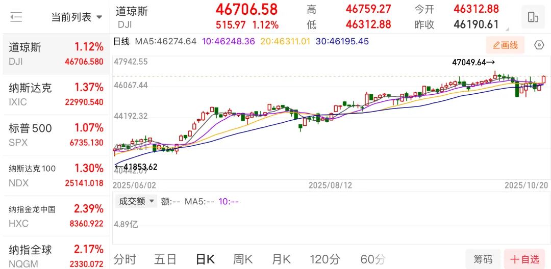 美股市场整体表现 - 美股三大指数集体上涨,道琼斯工业平均指数上涨515.97点,涨幅1.12%,报收46706.58点 [1] - 纳斯达克指数上涨310.57点,涨幅1.37%,报收22990.54点 [1] - 标普500指数上涨71.12点,涨幅1.07%,报收6735.13点 [1] 科技行业 - 大型科技股多数上涨,苹果公司股价上涨近4%,创下收盘新高 [3] - 脸书上涨超过2%,特斯拉、亚马逊、谷歌上涨超过1%,微软上涨0.63% [3] - 英伟达股价下跌0.32% [3] 金融行业 - 银行股全线上涨,富国银行上涨超过3%,花旗和摩根士丹利上涨超过2% [4] - 摩根大通、高盛、美国银行上涨超过1% [4] 半导体与能源行业 - 芯片股多数上涨,安森美半导体和科天半导体上涨超过4%,ARM和超威半导体上涨超过3% [5] - 能源股集体上涨,斯伦贝谢上涨超过2%,雪佛龙上涨近1%,埃克森美孚和西方石油小幅上涨 [5] 贵金属与大宗商品 - 黄金股走高,诺华黄金资源上涨超过5%,科尔黛伦矿业和巴里克黄金上涨超过4% [6] - 国际贵金属期货收涨,COMEX黄金期货上涨3.82%至4374.30美元/盎司,伦敦现货黄金上涨2.45%至4355.69美元/盎司 [7] - COMEX白银期货上涨2.59%至51.40美元/盎司 [7] - 原油期货收跌,美油主力合约下跌0.38%至56.93美元/桶,布伦特原油主力合约下跌0.57%至60.94美元/桶 [7] 中概股表现 - 纳斯达克中国金龙指数收涨2.39%,热门中概股普遍上涨 [7] - 爱奇艺上涨超过8%,蔚来上涨近5%,金山云上涨超过4%,阿里巴巴上涨近4% [7] - 哔哩哔哩和百度上涨近2% [7] 市场驱动因素 - 市场预期美国政府可能结束停摆,对股指形成支撑 [7] - 美国政府试图避免贸易局势全面恶化,以减轻对本国经济的潜在冲击 [7] - 美股第三季度财报季开局强劲,增强了投资者信心 [7] - 市场普遍预期美联储在10月下旬的会议上将再度降息25个基点 [7] - 全球原油产量持续增长,而经济增速放缓导致供需矛盾加剧,施压油价下跌 [7] - 加沙协议签署及解决乌克兰冲突的努力加强使地缘风险溢价下降 [7]
