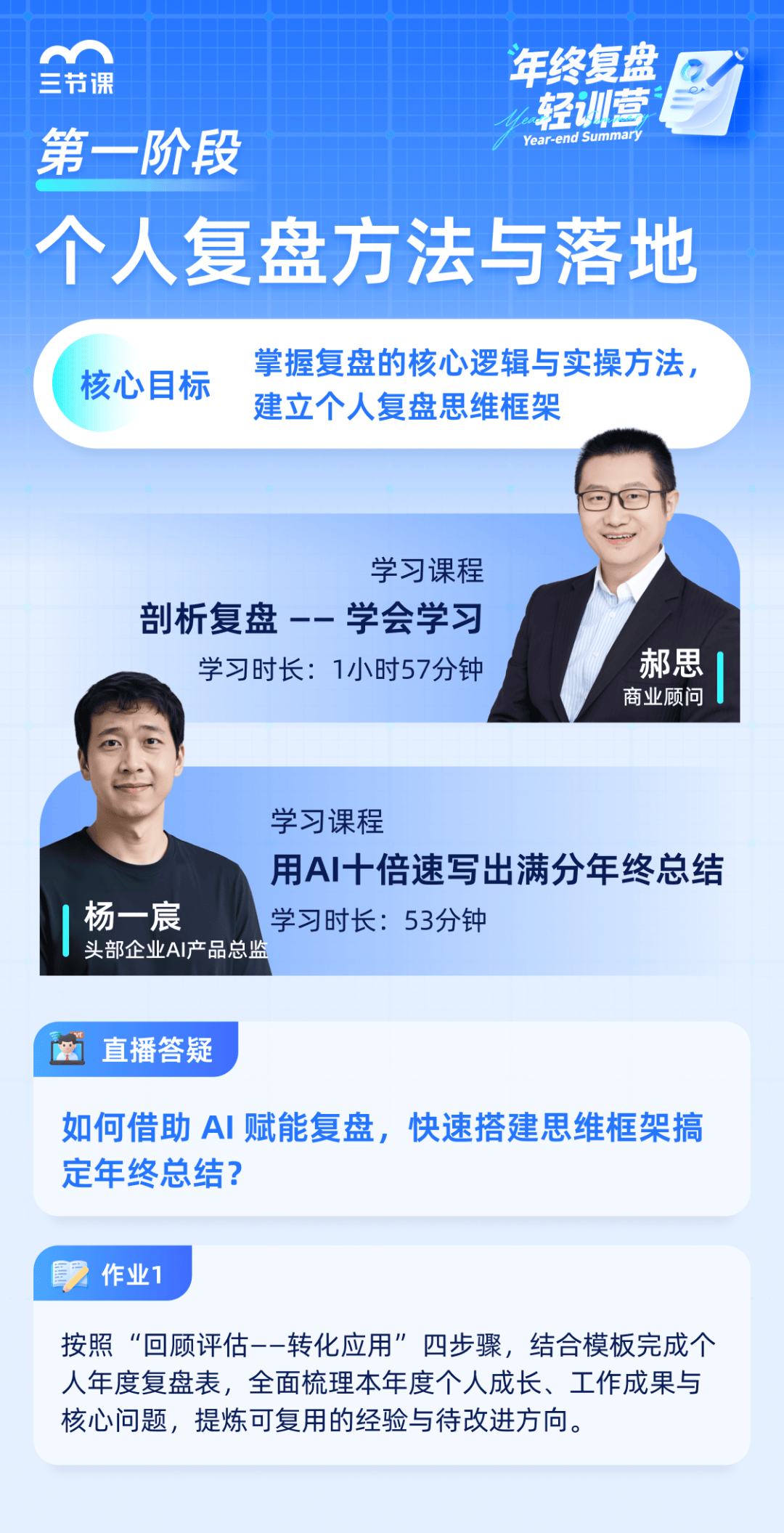 公司近期活动回顾 - 公司近期举办了“三节课018期年终复盘轻训营”,这是一项会员专属权益活动,共有超过280名学员参与学习和打卡 [1] - 该轻训营为期16天,围绕“2025总结×2026展望”核心主题,设计了四个阶段的学习路径,旨在帮助学员将“不会做”变成“能上手” [1] 轻训营核心学习阶段 - 第一阶段聚焦个人复盘,教授“回顾-评估-反思-转化”的全流程逻辑,并提供专属工具模板,帮助学员将年度总结转化为成长沉淀 [2] - 第二阶段拆解系统性团队复盘方法,涵盖从目标校准到行动落地的完整步骤,并提供具体工具,旨在打造高效复盘会以推动业务增长 [5] - 第三阶段运用设计思维重构职业发展路径,通过科学工具帮助学员对齐个人价值与成长目标,寻找长期发展方向 [10] - 第四阶段聚焦目标管理落地,教授共创式目标制定方法,将年度大目标拆解为可执行、可跟踪的小任务,确保个人与团队目标同频 [14] 实战赋能与作业设计 - 轻训营设计了4套实战作业,分别对应四个学习阶段,引导学员将方法转化为能力,作业包括个人年度复盘表、团队复盘画布、奥德赛计划规划表和策略行动计划表 [17][18][21] - 个人年度复盘表作业要求学员结合自身实际,留出至少30分钟时间进行梳理,并按照“回顾评估-分析反思-萃取提炼-转化应用”的步骤完成 [18] 案例分享内容 - 轻训营精选了2个大厂实战案例进行分享,旨在帮助学员拆解背后的逻辑并将成功经验转化为自己的“解题思路” [21] - 案例一为美团大住宿事业部“从0到1突围”,其核心秘诀被总结为“系统性复盘” [21] - 案例二为阿里巴巴的“OKR+共创会”模式,通过让员工参与目标制定,将“要我做”转变为“我要做”,以实现战略目标的对齐 [25] 直播答疑与专家支持 - 轻训营组织了2场主题直播答疑,针对性解决学员的核心困惑 [27] - 首场直播主题为“AI助力年终总结:告别低效流水账”,由拥有10年互联网产品经验的杨一宸老师主讲,拆解了复盘四大误区,并手把手演示了如何用AI工具搭建结构化框架 [27][30] - 第二场直播主题为“三步极简复盘:做好年度规划”,由拥有近20年企管实战经验的郑强老师主讲,分享了“复盘画布模板+方法总结” [33][35] 学员参与与学习成果 - 学员对直播答疑表现出高度热情,提前准备问题并在直播后持续交流 [38] - 课程平均完课率超过70%,考虑到学员多为在职学习,这一完成度被认为非常出色 [38] - 本次学习共有超过280人参与,学员积极参与群内互动,例如李大刚同学在开营第一天就完成了当日全部课程的学习 [38]