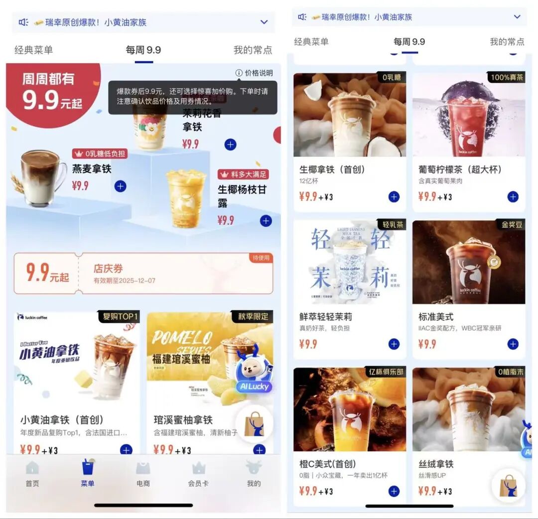 核心观点 - 瑞幸咖啡“每周9.9元”优惠活动自2023年启动以来,优惠范围及力度逐步缩水,从全场饮品可用演变为仅限少量指定饮品且部分产品需额外“加3元”购买,引发消费者对其营销真实性的质疑 [1][2][4] - 公司商业策略已从初期的“获客扩张”转向“盈利平衡”,优惠活动调整是用户筛选及应对盈利能力压力的结果,该活动作为品牌符号和引流抓手预计将持续但形式将更灵活 [5][7][9][13] 优惠活动演变 - 2023年上半年启动“每周9.9元”活动,初期全场饮品均可使用优惠券 [1] - 2024年2月,活动缩水至仅8款指定饮品可参与,相关话题登上微博热搜 [7] - 当前活动状态下,仅茉莉花香拿铁、燕麦拿铁等6款饮品可在部分门店使用9.9元优惠券,且许多产品需在9.9元基础上额外“加3元”购买 [1][4] 财务表现与策略关联 - 2023年二季度月均交易客户数达4307万,同比涨一倍,三季度月均交易客户数增至5848万,单季净收入72亿元,同比增长84.9% [5][6] - 2023年三季度经营利润9.63亿元,但经营利润率从18.9%环比降至13.4%,四季度骤减至3% [7] - 2024年一季度录得6511万元亏损,经营利润率降至-1%,主因是9.9元活动拉低产品平均售价及门店扩张致成本增加 [7] - 2024年二季度经营利润转正为10.5亿元,经营利润率回升至12.5% [7] - 2025年三季度经营利润17.77亿元,经营利润率11.6% [8] 用户增长与营销策略 - 2025年三季度新增交易客户超4200万,月均交易客户数同比增长40.6%达1.12亿,累计交易客户数突破4.2亿 [9] - 2024年推出119款新品,全年联名约22次,平均每月2次,覆盖游戏、影视等多领域,与贵州茅台联名的酱香拿铁首日销量542万杯,销售额突破1亿元 [9] - 2025年上半年开启11起IP联动合作,如与《疯狂动物城2》联动的周边产品获市场好评 [10] 门店扩张与海外布局 - 2023年三季度净新开门店2437家,门店总数超1.3万家 [6] - 2025年三季度净新开门店3008家,总门店数达29214家,其中国际市场门店118家 [11] - 出海进程:2023年3月进入新加坡,2025年1月进入马来西亚,2025年6月在美国开出首批门店 [11] 未来展望 - 公司管理层表示正积极推动重回美国主板上市进程,但称目前没有确定时间表 [13] - 9.9元活动因已成为强大品牌符号和引流抓手,且公司凭借供应链优势能维持微利,预计不会完全放弃,但可能转向更灵活的促销形式如会员专享、限时折扣等 [13]