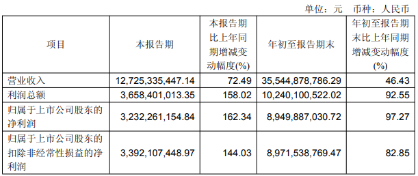 财务业绩表现 - 2025年前三季度公司营业收入为355.45亿元,同比增长46.43% [1] - 2025年前三季度归属于上市公司股东的净利润为89.50亿元,同比增长97.27% [1] - 2025年前三季度归属于上市公司股东的扣除非经常性损益的净利润为89.72亿元,同比增长82.85% [1] - 2025年前三季度经营活动产生的现金流量净额为135.82亿元,同比增长135.00% [1] - 2025年第三季度单季营业收入为127.25亿元,同比增长72.49% [2] - 2025年第三季度单季归属于上市公司股东的净利润为32.32亿元,同比增长162.34% [2] 资产与负债状况 - 截至2025年9月30日,公司总资产为902.86亿元,负债合计为443.31亿元,资产负债率为49.10% [2] - 截至2025年9月30日,公司一年内到期的非流动负债为64.49亿元,长期借款为206.43亿元,有息负债共计270.92亿元 [3] 股东股权与质押情况 - 公司控股股东宝丰集团持股数量为2,614,211,270股,持股比例为35.65% [3] - 宝丰集团累计质押公司股份700,000,000股,占其所持公司股份的26.78%,占公司总股本的9.55% [3] - 宝丰集团及其一致行动人东毅国际合计持股数量为4,614,211,270股,持股比例为62.92% [3] - 宝丰集团及其一致行动人累计质押公司股份950,000,000股,占其所持股份比例的20.59%,占公司总股本比例的12.95% [3] - 一致行动人东毅国际持股数量为2,000,000,000股,持股比例为27.27%,其累计质押股份为250,000,000股,占其所持股份的12.5%,占公司总股本的3.41% [4]