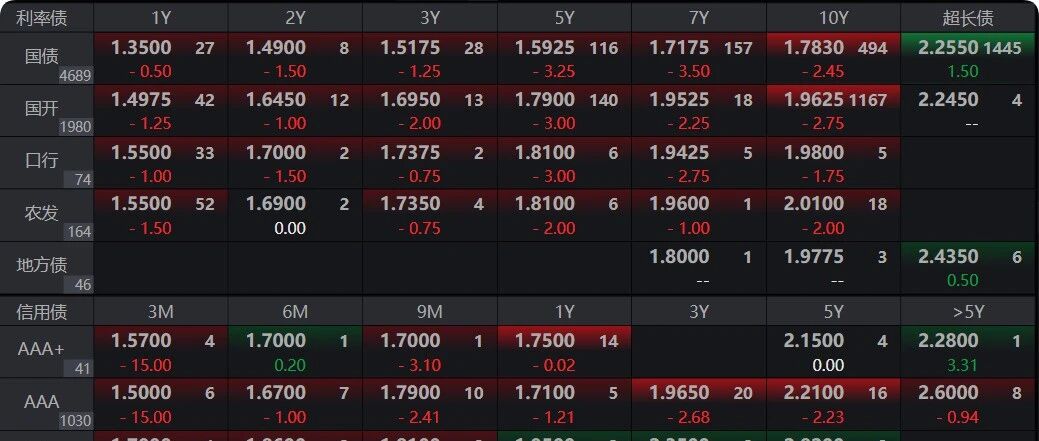 资金市场状况 - 央行公开市场净回笼1057亿元 当日开展1827亿元7天期逆回购操作并有2884亿元逆回购到期 [4] - 资金利率小幅回落 DR001报1.31% DR007报1.45% 显示月初资金面均衡偏松 [5] - 银行间回购成交量显著 R001成交62209.6亿元占比87.91% R007成交7665.04亿元占比10.83% [6] 利率债表现 - 10年期国债收益率下行1.15bp至1.7685% 30年期国债收益率下行0.05bp至2.0175% [7][8] - 国开债收益率普遍下行 10年期国开债收益率下行0.5bp至1.87% 超长端国开债下行1.5bp至2.095% [10] - 口行债及农发债中长端收益率下行 7年期口行债下行0.8bp 10年期农发债下行1.25bp [10] 信用债走势 - AAA级信用债收益率整体下行 1年期下行0.96bp至1.64% 5年期下行0.69bp至2.0575% [10] - AA+级信用债短端收益率分化 3个月期下行1.61bp至1.58% 但6个月期上行1.58bp至1.76% [10] - AA级债券波动显著 9个月期收益率上行6.18bp至2.1% 而1年期收益率下行8.11bp至2.36% [10] 宏观经济数据 - 8月官方制造业PMI为49.4 基本符合市场预期 [7] - 8月中国制造业PMI达50.5 重新回到扩张区间 [7] 股债市场联动 - 股市小幅上涨逼近3888点前高 国债期货同步走强 呈现"股债迷你双牛"格局 [8] - 国债期货大幅增仓 疑似权益资金通过债券市场进行避险对冲操作 [8] - 黄金白银价格携手创新高 反映避险情绪与风险偏好同步上升的特殊市场状态 [8]