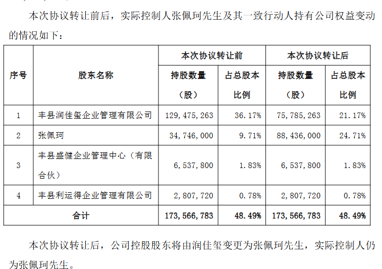 明阳电路(300739)10月21日晚间发布公告,公司原控股股东丰县润佳玺企业管理有限公司(下称"润佳玺") 拟通过协议转让方式,将其持有的15%公司股份转让给公司实际控制人张佩珂。 | 序号 | 股东名称 | 本次协议转让前 | | 本次协议转让后 | | | --- | --- | --- | --- | --- | --- | | | | 持股数量 | 占总股本 | 持股数量 | 占总股本 | | | | (股) | 比例 | (股) | 比例 | | 1 | 丰县润佳玺企业管理有限公司 | 129, 475, 263 | 36. 17% | 75, 785, 263 | 21. 17% | | 2 | 张佩珂 | 34. 746. 000 | 9.71% | 88. 436. 000 | 24. 71% | | 3 | 丰县盛健企业管理中心(有限 合伙) | 6.537. 800 | 1. 83% | 6.537.800 | 1. 83% | | 4 | 丰县利运得企业管理有限公司 | 2.807.720 | 0. 78% | 2.807.720 | 0. 78% | | | 合计 | 173.566 ...