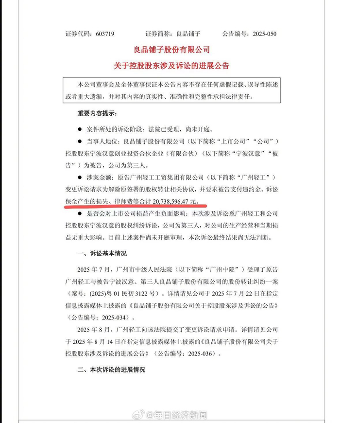 良品铺子股权纠纷升级,广州轻工索赔2073万并申请解除协议