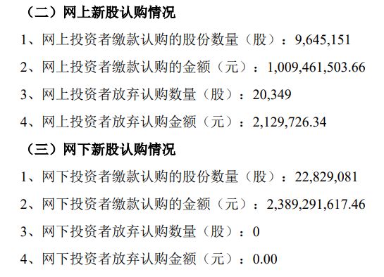 发行结果与认购情况 - 网上及网下认购缴款工作已于2025年12月9日结束 [1] - 网上投资者缴款认购964.52万股,金额为10.09亿元,放弃认购20,349股,金额为212.97万元 [1] - 网下投资者缴款认购2,282.91万股,金额为23.89亿元,无放弃认购 [1] - 所有投资者放弃认购的股份由保荐人(主承销商)包销 [1] 发行定价与募资规模 - 发行价格确定为104.66元/股 [4] - 新股发行数量为4,010万股 [4] - 预计募集资金总额为41.97亿元,扣除发行费用2.98亿元后,预计募集资金净额为38.99亿元 [4] - 公司募投项目预计使用募集资金为39亿元 [4] 网上发行申购情况 - 网上发行有效申购户数达517.52万户 [4] - 有效申购股数为288.62亿股 [4] - 网上发行初步中签率为0.02223023% [4] - 启动回拨机制后,最终中签率为0.03348913% [4]