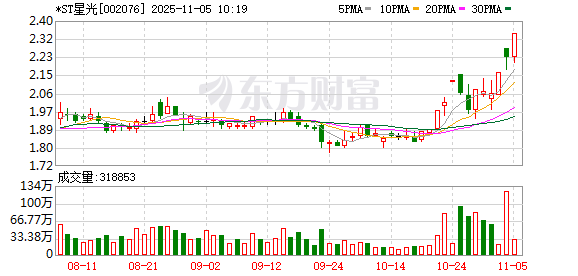 *ST星光再度涨停,11个交易日内录得5个涨停,累计涨幅为23.81%,累计换手率为67.00%。截至 9:35,该股今日成交量2810.78万股,成交金额6428.19万元,换手率2.70%。最新A股总市值达25.95亿 元,A股流通市值24.39亿元。 公司发布的三季报数据显示,前三季公司共实现营业收入1.69亿元,同比增长36.04%,实现净利润 320.25万元,同比增长256.29%,基本每股收益为0.0029元,加权平均净资产收益率1.08%。 近日该股表现 | 日期 | 当日涨跌幅(%) | 换手率(%) | 主力资金净流入(万元) | | --- | --- | --- | --- | | 2025.11.04 | 3.24 | 11.90 | -4097.23 | | 2025.11.03 | 4.85 | 2.17 | 1697.80 | | 2025.10.31 | -0.48 | 5.77 | -944.86 | | 2025.10.30 | -0.48 | 6.53 | -1559.65 | | 2025.10.29 | 5.05 | 7.89 | 842.03 | | 2025.1 ...