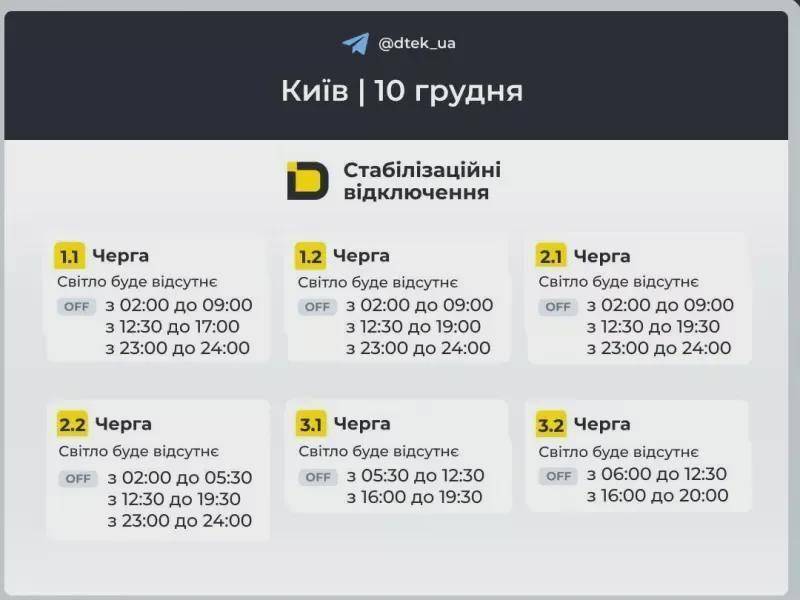 俄罗斯军队在2025年11月~12月期间,对乌克兰全境能源设施、电力设施和铁路设施发动了多次大规模停电,部分设施甚至在尚未维修完毕的情况,反反 复复遭到空袭。 为了更为直观的看懂目前基辅的供电情况,我们先来看看乌克兰能源公司DTEK最新发布的停电计划。 需要注意的是,这些"停电计划"也只是理想状态,谁也不知道俄军下一轮空袭会打中哪里,而且由于电力设施的不稳定性和脆弱性,有时即使没有遭致俄 军的空袭,也会出现设施故障。 事实上,每个城市的"停电计划"是有所不同的,比如说: 文尼察,本市实行全天分时段停电,整体来看,文尼察居民的停电时长在邻近地区中属最严格之列——每日停电13至17小时。 | @dtek_ua | | | | | | | | | | | | | | | | | | | | | | | | | | | | | | | | | | | | | | | | | | | | | | | | | | | | | | --- | --- | --- | --- | --- | --- | --- | --- | --- | --- | --- | --- | --- | --- | --- | --- | - ...