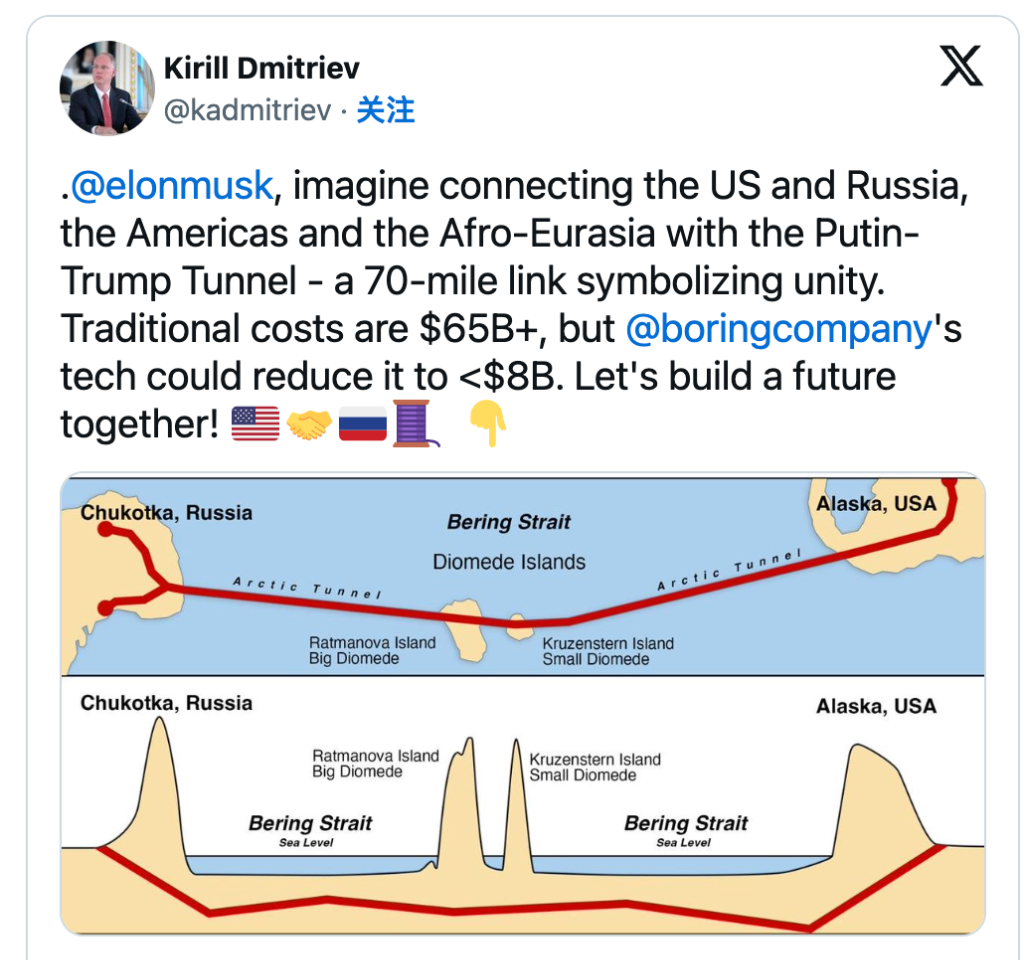 俄罗斯主权基金主管@马斯克:建一条“白令海峡隧道”,打通俄美