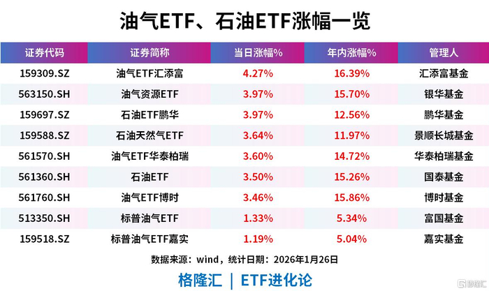 午后油气股走高,通源石油涨超13%;和顺石油、洲际油气、中曼石油涨停。 油气ETF汇添富涨超4%;油气资源ETF、石油ETF鹏华、石油天然气ETF、油气ETF华泰柏瑞、石油 ETF、油气ETF博时涨超3%。 | 证券代码 | 证券简称 | 当日涨幅% | 年内涨幅% | 管理人 | | --- | --- | --- | --- | --- | | 159309.SZ | 油气ETF汇添富 | 4.27% | 16.39% | 汇添富基金 | | 563150.SH | 油气资源ETF | 3.97% | 15.70% | 银花真金 | | 159697.SZ | 石油ETF鹏华 | 3.97% | 12.56% | 鹏华基金 | | 159588.SZ | 石油天然气ETF | 3.64% | 11.97% | 景顺长城基金 | | 561570.SH | 油气ETF华泰柏瑞 | 3.60% | 14.72% | 华泰柏瑞基金 | | 561360.SH | 石油ETF | 3.50% | 15.26% | 国泰基金 | | 561760.SH | 油气ETF博时 | 3.46% | 15.86% | 博时 ...