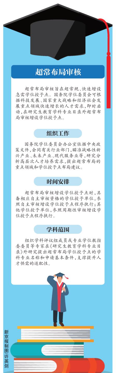 (来源:千龙网) 12月25日,国务院学位委员会印发《博士硕士学位授予资格审核办法》(以下简称《办法》)。记者注 意到,相比2024年1月印发的《博士硕士学位授权审核办法》,本次《办法》新建立超常布局审核工作 机制,根据需求即时启动超常布局审核,自主审核单位参考自主审核方式、非自主审核单位参考周期性 审核方式开展审核工作,弥补以往审核工作的时间局限性。 焦点1 突出战略需求等三个方面导向 教育部学位管理与研究生教育司负责人表示,《办法》修订主要突出三个方面导向。 三是突出质量规范,以严格的标准条件筑牢质量底线,严把工作程序和学位授予点建设质量,完善对自 主审核单位的质量监管,建立对新增学位授予单位的复核机制,健全学位授予资格转移的审核机制,确 保学位授予资格审核工作规范有序开展。 焦点2 建立超常布局审核工作机制 新版《办法》明确,学位授予资格审核包括周期性审核、动态调整、自主审核、超常布局审核四种方 式。 超常布局审核作为一种新的学位授予资格审核方式,将如何开展? 当前,新一轮科技革命和产业变革深入发展,技术创新进入密集活跃期,我国科技发展、国家重大战略 和经济社会发展重点领域对高层次人才需求快速增长,急需 ...