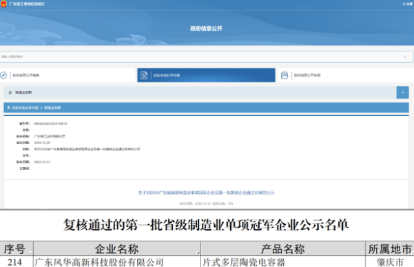 近日,广东省工业和信息化厅发布《关于2025年广东省省级制造业单项冠军企业及第一批复核企业 通过名单的公示》。风华高科主导产品片式多层陶瓷电容器(MLCC)凭借其卓越市场表现、领先技术 实力与深厚产业积淀,成功通过复核,再次获评"省级制造业单项冠军企业"。这一荣誉充分肯定了风华 高科在电子基础元器件细分领域长期专注创新、引领国产化进程的标杆地位。 | 序号 企业名称 | 产品名称 | - 所属地市 | | --- | --- | --- | | 214 广东风华高新科技股份有限公司 | 片式多层陶瓷电容器 | 肇庆市 | 公司自成立以来,便开始使用并注册了"FH"等商标。"风华"品牌先后被认定为"广东省著名商 标"和"中国驰名商标"。公司拥有1个中国名牌产品和9个广东省名牌产品,先后荣获"全国质量工作先进 单位""广东省政府质量奖"等荣誉,并入选"中国十大电子元件杰出品牌"。 凭借卓越的综合实力,风华高科核心产品MLCC与片式电阻器均荣获"全国制造业单项冠军产品"称 号,公司被评为广东省基础电子元器件产业链"链主"企业,整体品牌影响力与市场认可度持续增强。此 次MLCC产品再度获评省级制造业单项冠军,不仅进一 ...