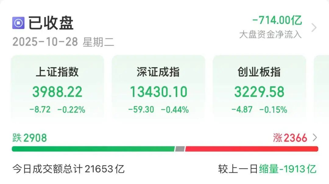 10月28日,A股冲高回落,三大指数集体收跌,沪指盘中站上4000点。 截至收盘,上证指数跌0.22%,报3988.22点,深证成指跌0.44%,创业板指跌0.15%。全市场今日成交额超2.16万亿元。 盘面上,区域概念板块活跃,福建本地股全天强势,路桥信息午后快速冲高,"30CM"涨停,海峡创新(300300)"20CM"涨停,福建水泥(600802)、漳 州发展(000753)、厦门港务(000905)等近20股涨停。 自由贸易港概念反复活跃,福建自贸区、海南自贸区、中韩自贸区、广东自贸区等板块涨幅居前。军工装备、交通航运、电池等相关板块涨幅居前。有色 概念、贵金属、钢铁、稀土永磁等前期强势板块回调。 人形机器人概念午后异动。三花智控(002050)盘中直线拉升,一度触及涨停,股价创历史新高,截至收盘,成交额为180.85亿元,最新市值为2214.3亿 元,位于证券人气榜和同花顺(300033)热榜第一名。锦富技术(300128)临近尾盘直线拉升,实现"20CM"涨停,股价创阶段新高,锦富技术今日在其 微信公众号宣布,公司收获液冷板订单。 人形机器人概念午后活跃 今日午后,人形机器人概念反复活跃,截至收盘 ...