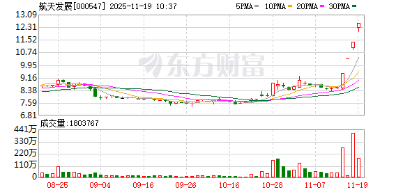 据天眼查APP显示,航天工业发展股份有限公司成立于1993年11月20日,注册资本159846.8269万人民 币。(数据宝) 近日该股表现 航天发展盘中涨停,已连收4个涨停板,截至9:41,该股报12.53元,换手率11.09%,成交量1.76亿股, 成交金额21.77亿元,涨停板封单金额为9.30亿元。连续涨停期间,该股累计上涨46.55%,累计换手率 为55.25%。最新A股总市值达200.29亿元,A股流通市值199.02亿元。 证券时报·数据宝统计,两融数据来看,该股最新(11月18日)两融余额为9.34亿元,其中,融资余额 9.32亿元,较前一个交易日增加2.79亿元,环比增长42.76%,近4日累计增加2.90亿元,环比增长 45.30%。 龙虎榜数据显示,该股因连续三个交易日内,涨幅偏离值累计达20%、日涨幅偏离值达7%上榜龙虎榜2 次,买卖居前营业部中,机构净卖出4910.63万元,深股通累计净买入8319.57万元,营业部席位合计净 买入4.91亿元。 公司发布的三季报数据显示,前三季公司共实现营业收入16.97亿元,同比增长42.59%,实现净利 润-4.89亿元,同比增长12.38%, ...