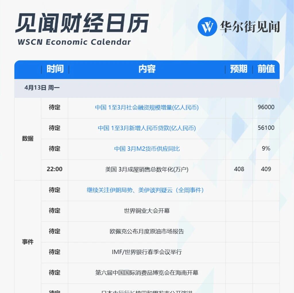 见闻财经日历 WSCN Economic Calendar 华尔街见闻 | 时间 | | 内容 | 预期 前值 | | --- | --- | --- | --- | | 4月13日 周一 | | | | | 数据 | 待定 | 中国 1至3月社会融资规模增量(亿人民币) | 96000 | | 待定 | | 中国 1至3月新增人民币贷款(亿人民币) | 56100 | | 待定 | | 中国 3月M2货币供应同比 | ರಿ% | | 22:00 | | 美国 3月成屋销售总数年化(万户) | 408 409 | | 事件 | 待定 | 继续关注伊朗局势、美伊谈判疑云(全周事件) | | | 待定 | | 世界铜业大会开幕 | | | 待定 | | 欧佩克公布月度原油市场报告 | | | 待定 | | IMF/世界银行春季会议举行 | | | 待定 | | 第六届中国国际消费品博览会在海南开幕 | | | 待定 | | 日本央行行长植田和男发表公开演讲 | | | 财报 | | 高盛集团 | | | 4月14日 周二 | | | | | 数据 | 02:00 | 美国 3月政府预算(亿美元) | -3075 ...