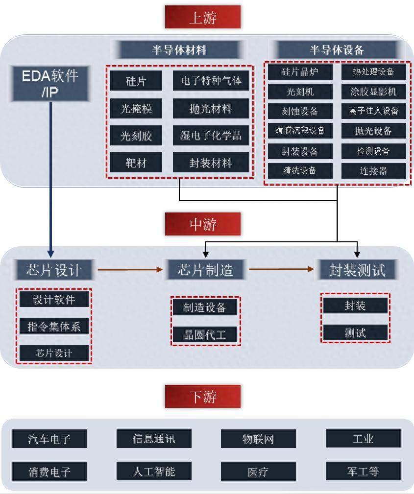 文章核心观点 - 芯片是信息化、数字化的关键计算单元,广泛应用于消费电子、AI及工业等领域 [1] - 中国在整个芯片产业链中整体实力较弱,特别是在上游环节存在明显短板,进步空间巨大 [15][18] - 中国在芯片封测环节表现相对较好,但在EDA/IP、半导体材料、设备、设计及下游市场份额方面高度依赖进口,与美国、日本等国存在较大差距 [15][18] 产业链上游:EDA/IP、材料与设备 - EDA/IP市场由美国企业垄断,全球市场份额超过80%,中国企业份额不足10% [3][5] - 在IP领域,涉及ARM、X86等大指令集及CPU、GPU等小IP核,美国与欧洲企业占据90%以上市场份额 [5] - 半导体材料市场以硅片价值占比最高,达33%,其次为特种气体(14%)和光掩膜(13%) [7] - 日本在半导体材料领域占据全球约60%份额,中国份额不足20%,依赖进口 [7] - 半导体设备市场由美国、日本、荷兰主导,全球前十大设备商中仅北方华创一家中国公司上榜,排名第七 [7] - 中国半导体设备自给率不足30%,高度依赖进口 [7] 产业链中游:设计、制造与封测 - 芯片设计领域美国优势显著,2025年一季度全球前十大IC设计企业中美国占六家,份额合计超80% [10] - 中国大陆企业仅豪威集团上榜,市场份额为1% [10] - 芯片制造环节,中国产能占全球20%以上,为美国的两倍多,但技术落后数代 [13] - 芯片封测环节中国实力较强,全球前十大封测企业中中国占四家,市场份额超过25% [16] 产业链下游:全球市场份额 - 美国在全球芯片市场份额中占据50.4%的绝对主导地位 [15] - 中国在全球芯片市场份额仅为4.5%,与美国差距悬殊,高度依赖进口 [15][18]