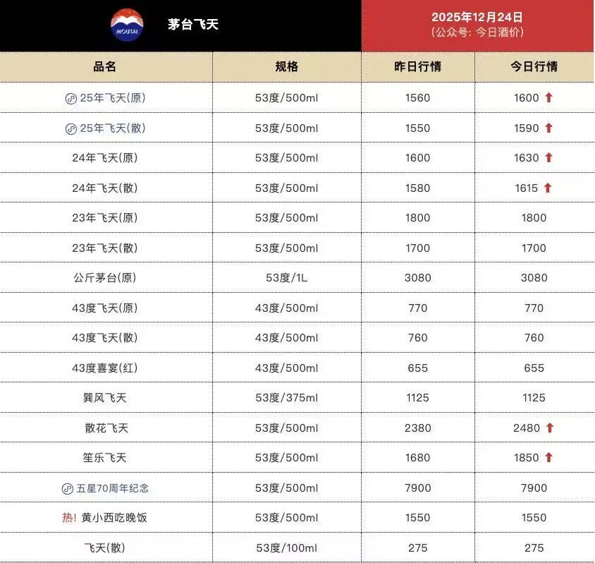 茅台产品批发价格近期波动 - 核心观点:茅台产品批发价格在近期经历下跌后出现全线上涨,市场波动显著,价格变化可能与即将举行的经销商大会及公司潜在的控量政策有关 [1][4] - 2025年12月24日,多款飞天茅台产品批发价较前一日上涨:25年飞天茅台原箱报1600元/瓶,上涨40元;25年飞天茅台散瓶报1590元/瓶,上涨40元;24年飞天茅台原箱报1630元/瓶,上涨30元;24年飞天茅台散瓶报1615元/瓶,上涨35元 [1][2] - 除主流飞天茅台外,其他部分产品价格亦上涨:散花飞天从2380元/瓶涨至2480元/瓶,上涨100元;笙乐飞天从1680元/瓶涨至1850元/瓶,上涨170元 [2][4] - 此次价格上涨发生在12月23日晚间,收复了近期部分跌幅 [4] 茅台产品价格前期下跌情况 - 在12月12日,飞天茅台价格曾走低并跌破官方指导价:2025年款53度500ml飞天茅台原箱报1495元/瓶,较前一日下跌15元;散瓶报1485元/瓶,较前一日下跌15元,均低于1499元/瓶的官方指导价 [2] - 公司证券部工作人员对此表示,价格跌破1499元/瓶可能与某些平台的补贴或为博流量设置低价有关,并指出当前价格已有所回升 [5] 市场事件与潜在政策背景 - 业内认为价格波动可能与12月28日即将举行的茅台经销商大会有关,预计会上可能发布新的产品和经营策略 [4] - 据媒体报道,贵州茅台近期推出控量政策,包括短期和中长期措施:短期措施为2025年12月内停止向经销商发放所有茅台产品(预付款已完成),直至2026年1月1日;中长期计划在2026年大幅削减非标产品配额,从源头减少使经销渠道利润缩减的产品供应 [4] - 公司证券部工作人员回应称,公司注重以需求驱动为主和渠道韧性保护,产品根据终端动销情况精准投放,未来市场政策仍在研究中,具体策略可能在渠道商联谊会上正式发布 [4] 公司股价表现 - 2025年12月24日,贵州茅台股价低开低走,小幅下跌至1404.59元 [6] - 本月初,公司股价曾跌破1400元,并在12月10日一度低至1359.22元 [6]