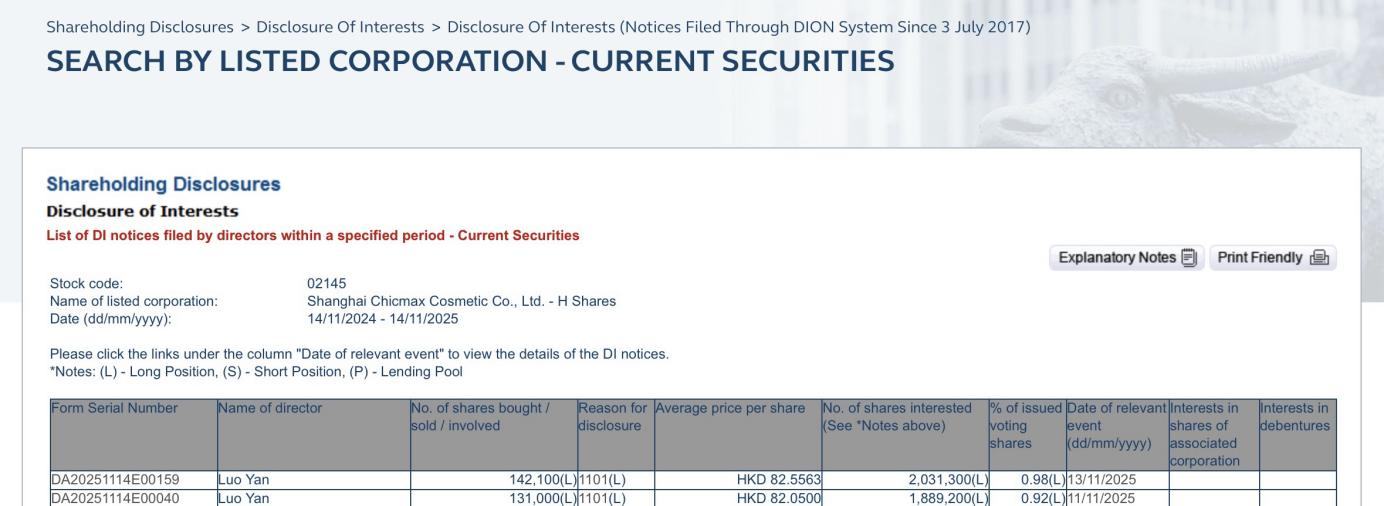 披露易信息显示,11月11日和11月13日,上美股份(02145)再获董事罗燕增持,共增持股份27.31万股,合计增持资金超2000万港元,每股均价分别为82.05港 元(11月11日)、82.56港元(11月13日)。据统计,上市以来,上美股份已累计获得公司董事增持股份超210万股,交易总价超9000万港币。 | Form Serial Number | Name of director | No. of shares bought | Reason for Average price per share No. of shares interested | | | 1% of issued Date | | --- | --- | --- | --- | --- | --- | --- | | | | sold / involved | disclosure | | (See "Notes above) | Monto even | | | | | | | | Is nate (dd/r | | DA20251114E00159 | Luo Yan | | 142,100(L)1101(L) | HKD ...