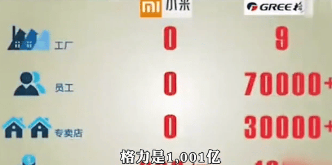 看到董明珠的视频,就纳闷她跟雷军是怎么回事,按道理来说哪怕两家公司的产品有竞争也用不着老大出来撂狠话,毕竟两人的江湖地位都已经很高了。 后来我去了解了他们的过往后才晓得不是什么私人恩怨,背后的原因很复杂。 现在我们就捋一捋。 一切都要从一张图说起。 2013年12月12日,在央视财经频道主办的第十四届中国经济年度人物颁奖盛典上,董明珠和雷军都获奖了,现场还有马云和王健林,主持人就放出一张图: 如果从工厂的数量来说,小米是0,格力是9。员工数量小米是0,格力是七万以上。专卖店小米是0,格力是三万以上。营业总收入小米是300亿,格力是 1007亿。 马云对此说了一句话:如果小米23年以后,还能够拿这张图那才叫本事。 这里就有个虚实之争。从这点来说,董明珠和雷军之间的故事是中国商业世界的一个鲜活样本。 在那天现场,董明珠就提出质疑,"如果全世界的工厂都关掉了,你还有销售吗?"而雷军表示现在强调专业化分工,做工厂的人专心把工厂做好,做产品的 人专心做产品。 两人都对自己的模式很有信心,于是就有了那个著名的"10亿赌局": 1、截至2025年10月,小米之家中国大陆地区门店总数约为17000家(2021年突破1万家), ...
