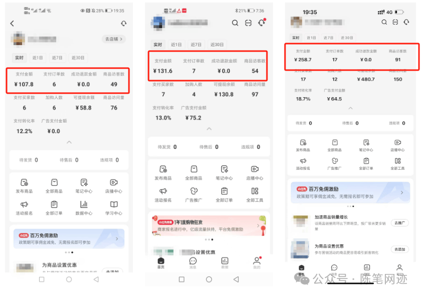 不多说啥,看图吧。 | SPirir | | | @ 图 & 28% ■ 19:35 | | --- | --- | --- | --- | | | | | 去店铺 > | | 实时 近1日 近7日 | | 近30日 | | | 支付会额 | 支付订单数 | 成功退款金额 商品访客数 | | | ¥ 107.8 | 6 | ¥ 0.0 49 | | | 支付买家数 | 加购人数 | 可提现余额 商品访问量 | | | 6 | 6 | ¥ 58.8 76 | | | 支付转化率 广告支付会额 | | | | | 12.2% ¥0.0 | | | | | N | | | | | 待发货 0 | 待售后 0 | 选频项 0 | | | (જે | ( | E | | | 发布商品 | 全部商品 | 笔记中心 店攝中心 | | | 다 | ਫ | Lill m | | | 活动报名 | 全部订单 | 酸据中心 学习中心 | | | dels 百万免佣激励 | | | | | 政策期可享佣金减免,无需报名即可参加 | | | | | ... | | | | | 为商品设置优惠 | | | mm 土壤机 | 在小 ...