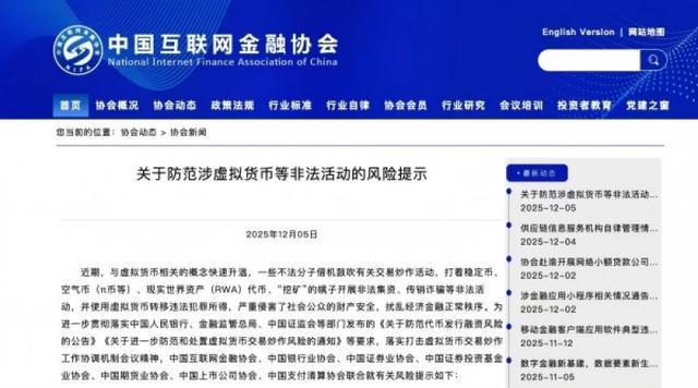 监管动态与政策定性 - 中国互联网金融协会等七家协会于12月5日晚间联合发布风险提示,指出近期虚拟货币相关概念快速升温,一些不法分子借机开展非法活动[2] - 不法分子打着稳定币、空气币(如π币)、现实世界资产代币、“挖矿”的幌子,进行非法集资、传销诈骗,并使用虚拟货币转移违法犯罪所得[2] - 该行为被指严重侵害社会公众财产安全,扰乱经济金融正常秩序[2] 虚拟货币及相关活动的官方定性 - 虚拟货币不由货币当局发行,不是国家法定货币,不具有与法定货币等同的法律地位,不能作为货币在境内流通使用[3] - π币等空气币被指无实质性技术创新,无明确商业应用场景和价值,发行运营机制不透明,欺诈和市场操纵问题严重[3] - 稳定币目前无法有效满足客户身份识别、反洗钱等要求,存在被用于洗钱、集资诈骗、违规跨境转移资金等风险[3] - 现实世界资产代币化活动存在虚假资产风险、经营失败风险、投机炒作风险等多重风险,且目前金融管理部门未批准任何此类活动[3] - 有关机构不得开展与虚拟货币、现实世界资产代币相关的业务[3] 对公众的警示与历史监管脉络 - 提示强调虚拟货币价格大起大落、波动剧烈,常被用于投机炒作和传销诈骗,呼吁社会公众增强风险意识,切勿参与相关活动及借“挖矿”名义的非法集资和非法发行证券活动[3] - 此前中国互联网金融协会曾多次联合发布相关风险提示,包括2022年4月发布《关于防范NFT相关金融风险的倡议》,要求不得以比特币等虚拟货币作为NFT发行交易的计价和结算工具[4] - 2021年5月发布《关于防范虚拟货币交易炒作风险的公告》,明确有关机构不得开展与虚拟货币相关的业务[4] - 2020年4月发布《关于参与境外虚拟货币交易平台投机炒作的风险提示》,提醒不参与虚拟货币交易及相关投机行为[4]