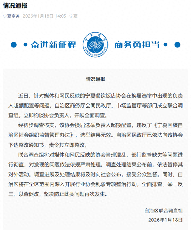据宁夏商务厅微信公众号"宁夏商务"消息,1月18日,宁夏回族自治区联合调查组发布情况通报: 近日,针对媒体和网民反映的宁夏餐饮饭店协会在换届选举中出现的负责人超额配置等问题,自治区商 务厅会同民政厅、市场监管厅等部门成立联合调查组,立即约谈协会负责人,开展全面调查。 经初步调查核实,该协会换届选举负责人超额配置,违反了《宁夏回族自治区社会组织监督管理办 法》,选举结果无效。自治区民政厅已依法向该协会下达整改通知书,责令其立即整改。 联合调查组将对媒体和网民反映的协会管理混乱、部门监管缺失等问题进行彻查,对发现的问题依法依 规严肃处理。调查处理结果公布前,依法暂停其对外活动。调查进展及处理结果将及时向社会公布,接 受公众监督。同时,自治区将在全区范围内深入开展行业协会乱象专项整治行动,全面排查、举一反 三、以查促改,坚决防止此类问题再次发生。 微信公众 号"宁夏商务"截图 据此前报道,近日,一则关于宁夏餐饮饭店协会拥有89名"副会长"的消息在网络上引发关注。 根据网上帖子,该协会2025年4月发布的换届选举结果,共选出会长1人、常务副会长10人、副会长28 人,新增补副会长42人。而在2026年1月9日的协会三 ...