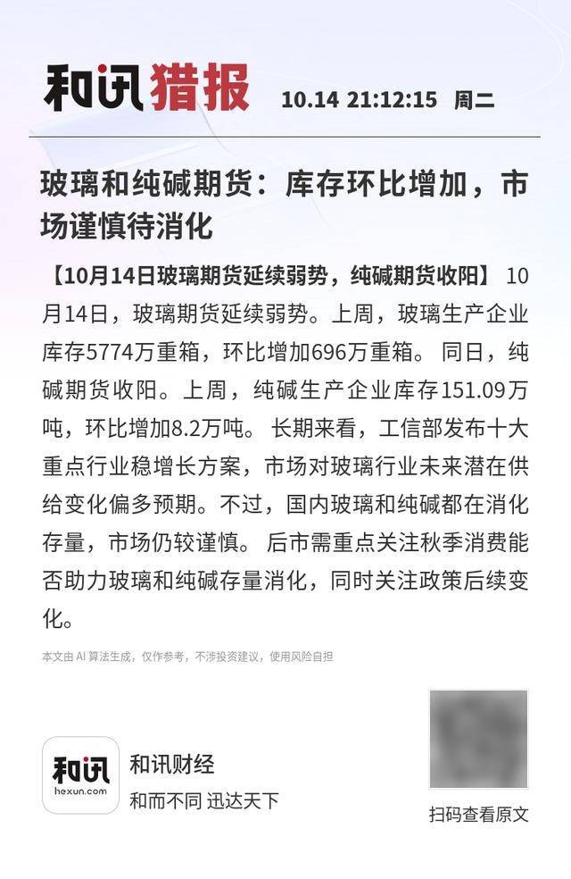 【10月14日玻璃期货延续弱势,纯碱期货收阳】10月14日,玻璃期货延续弱势。上周,玻璃生产企业库 存5774万重箱,环比增加696万重箱。 同日,纯碱期货收阳。上周,纯碱生产企业库存151.09万吨,环 比增加8.2万吨。 长期来看,工信部发布十大重点行业稳增长方案,市场对玻璃行业未来潜在供给变化 偏多预期。不过,国内玻璃和纯碱都在消化存量,市场仍较谨慎。 后市需重点关注秋季消费能否助力 玻璃和纯碱存量消化,同时关注政策后续变化。 本文由 AI算法生成,仅作参考,不涉投资建议,使用风险自担 和闭猎报 10.14 21:12:15 周= 玻璃和纯碱期货:库存环比增加,市 场谨慎待消化 本文由 Al 算法生成,仅作参考,不涉投资建议,使用风险自担 和讯财经 和而不同 迅达天下 扫码查看原文 【10月14日玻璃期货延续弱势,纯碱期货收阳】 10 月14日,玻璃期货延续弱势。上周,玻璃生产企业 库存5774万重箱,环比增加696万重箱。同日,纯 碱期货收阳。上周,纯碱生产企业库存151.09万 吨,环比增加8.2万吨。长期来看,工信部发布十大 重点行业稳增长方案,市场对玻璃行业未来潜在供 给变化偏多预期。不过,国内 ...