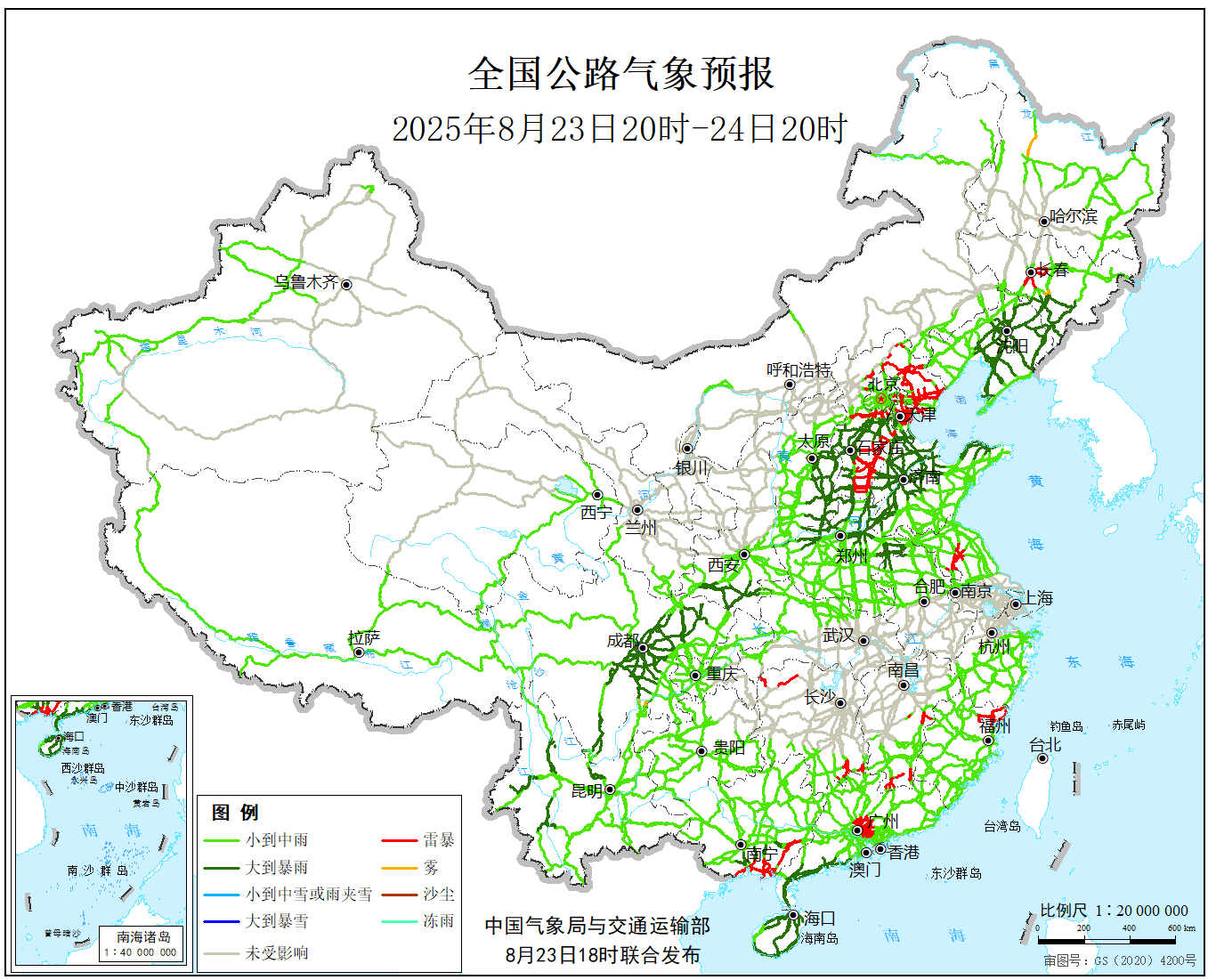 受大到暴雨影响的主要路段有: G2京沪高速天津境内路段、河北沧州—山东德州—泰安段 G3京台高速天津境内路段、河北沧州—山东德州—泰安段 G4京港澳高速河北高碑店—高邑段、河北磁县—河南安阳—卫辉段 G5京昆高速河北高碑店—冀晋省界—山西平定—太原段、陕西汉中境内路段、四川绵阳—雅安段、四川西昌—米易段、云南元谋—定武段 G1113丹阜高速辽宁凤城—沈阳段 G1212沈吉高速沈阳—辽宁抚顺段 G15沈海高速沈阳—辽宁瓦房店段、山东烟台—栖霞段、广东阳东—湛江段 G1511日兰高速山东随官屯—河南兰考段 G16丹锡高速辽宁海城—盘锦段 G18荣乌高速山东威海—蓬莱段、山东垦利—河北海兴—津冀省界段、天津—河北霸州—徐水段 G1811黄石高速河北沧州港—沧州段、河北藁城—石家庄段 G20青银高速山东淄博—鲁冀省界段、石家庄—冀晋省界—山西平定—太原段 G22青兰高速山东莱芜—冀鲁省界段、河北涉县—冀晋省界—山西黎城—长治段 G25长深高速津冀省界—河北黄骅—山东无棣—青州段 G2511新鲁高速辽宁新民—彰武段 G30连霍高速江苏张庄寨—河南夏邑—郑州段、河南洛阳—渑池段 G35济广高速济南—山东菏泽段、安徽亳州— ...