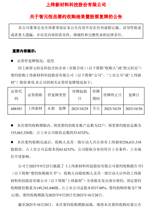 要约收购完成。 上纬新材(688585)10月29日晚间公告,截至2025年10月28日,上海智元恒岳科技合伙企业(有限合伙)(简 称"智元恒岳")要约收购公司股份期限届满。 | 证券代 | 证券简称 | 停复牌类型 | 停牌起始 | 停牌 | 停牌终止日 | 复牌日 | | --- | --- | --- | --- | --- | --- | --- | | 码 | | | H | 期间 | | | | 688585 | 上纬新材 | A 股 复牌 | 2025/10/29 | 全大 | 2025/10/29 | 2025/10/30 | 根据中登公司上海分公司提供的数据统计,本次要约收购期限内,预受要约的股东账户总数为22户,预 受要约股份总数为1.36亿股,占上市公司股份总数的33.6332%。本次要约收购完成后,智元恒岳持有公 司58.6232%股份,智元恒岳及其一致行动人共计持有公司63.6232%股份。 根据《中华人民共和国证券法》《上海证券交易所科创板股票上市规则》等相关规定,本次要约收购完 成后,公司股权分布仍符合上市条件,上市地位不受影响。 上纬新材表示,本次要约收购期限已届满,且要约收购 ...