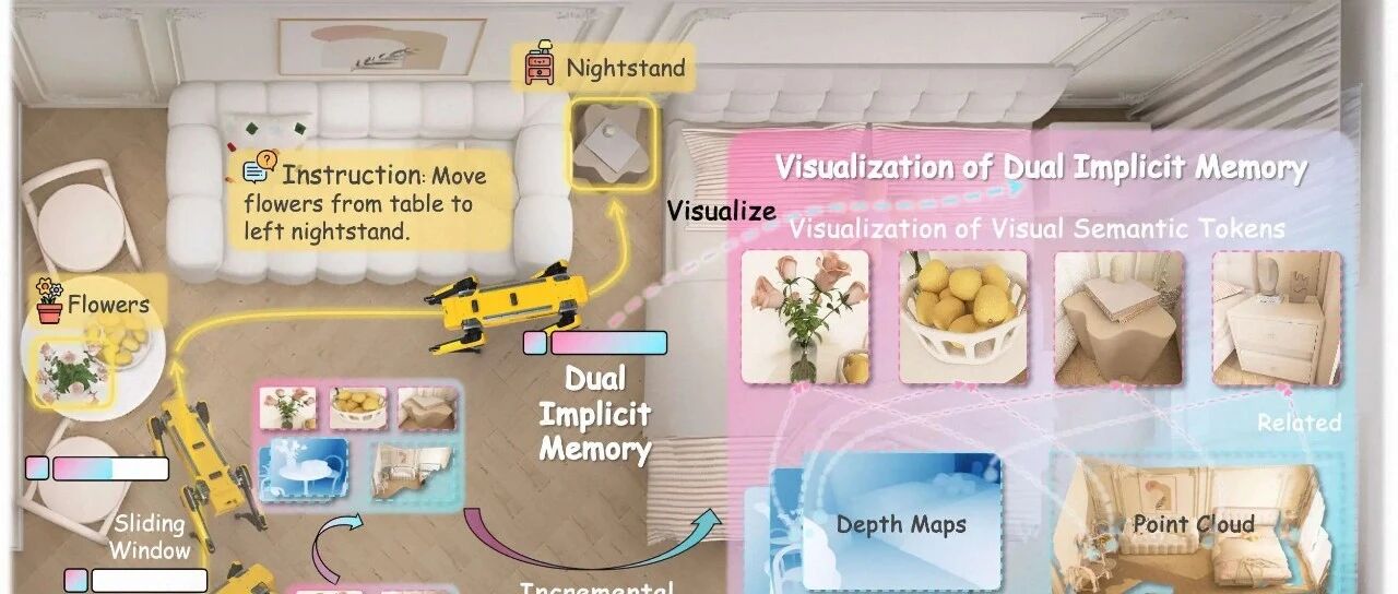 文章核心观点 - JanusVLN是一个创新的视觉-语言导航框架,其核心是双重隐式记忆范式,通过解耦语义与空间几何信息来解决现有方法的瓶颈[2] - 该框架仅需单目RGB视频流输入,无需昂贵传感器,即可实现强大的三维空间推理能力,并在权威基准测试中取得领先的性能[2][8] - 该方法标志着视觉-语言导航研究从“2D语义主导”迈向“3D空间与语义协同”的新阶段,为下一代具身智能体的开发指明了方向[19] 当前视觉-语言导航领域的技术瓶颈 - 现有方法依赖的显式记忆机制导致空间信息失真与丢失,难以精确编码连续的空间关系[3][5] - 存储历史图像帧的方法造成计算与推理效率低下,计算量随导航步数线性增长[5] - 无论是文本还是图像形式的显式记忆,其规模都会随导航轨迹延长而持续增长,引发“记忆爆炸”问题[5] JanusVLN的核心技术创新 - 提出双重隐式记忆,将记忆系统解耦为负责理解“是什么”的语义记忆和感知“在哪里”的空间几何记忆,均以神经网络键值缓存作为紧凑载体[7][8] - 集成预训练的3D视觉几何基础模型作为空间几何编码器,仅凭普通RGB视频流即可推断场景三维结构[8] - 采用混合增量更新策略,通过维护初始窗口和滑动窗口实现恒定大小的记忆,避免重复计算,大幅提升推理效率[8][11] 框架构成与工作原理 - 采用双编码器架构,2D视觉语义编码器提取高级语义特征,3D空间几何编码器提取蕴含三维结构的几何特征[11] - 将语义和空间几何编码器的注意力键值对缓存作为隐式记忆的载体,形成紧凑高效的双重记忆[11] - 缓存更新策略结合滑动窗口与初始窗口,滑动窗口确保对近期环境的敏锐感知,初始窗口作为“注意力接收器”提供全局上下文[11] 实验性能与结果 - 在VLN-CE R2R Val-Unseen数据集上,JanusVLN取得了导航误差4.78,成功率65.2,成功路径加权指标56.8的优异性能[13] - 在RxR Val-Unseen数据集上,JanusVLN的成功率达到56.2,成功路径加权指标47.5,标准化动态时间规整指标62.1[14] - 与依赖全景视图、深度图等多种昂贵输入的先进方法相比,JanusVLN仅凭单目RGB输入就在成功率指标上实现10.5-35.5个点的巨大提升[21] - 相较于同样使用RGB输入但采用显式记忆的先进方法,JanusVLN在成功率指标上取得3.6-10.8个点的提升,且使用更少的辅助训练数据[21]
